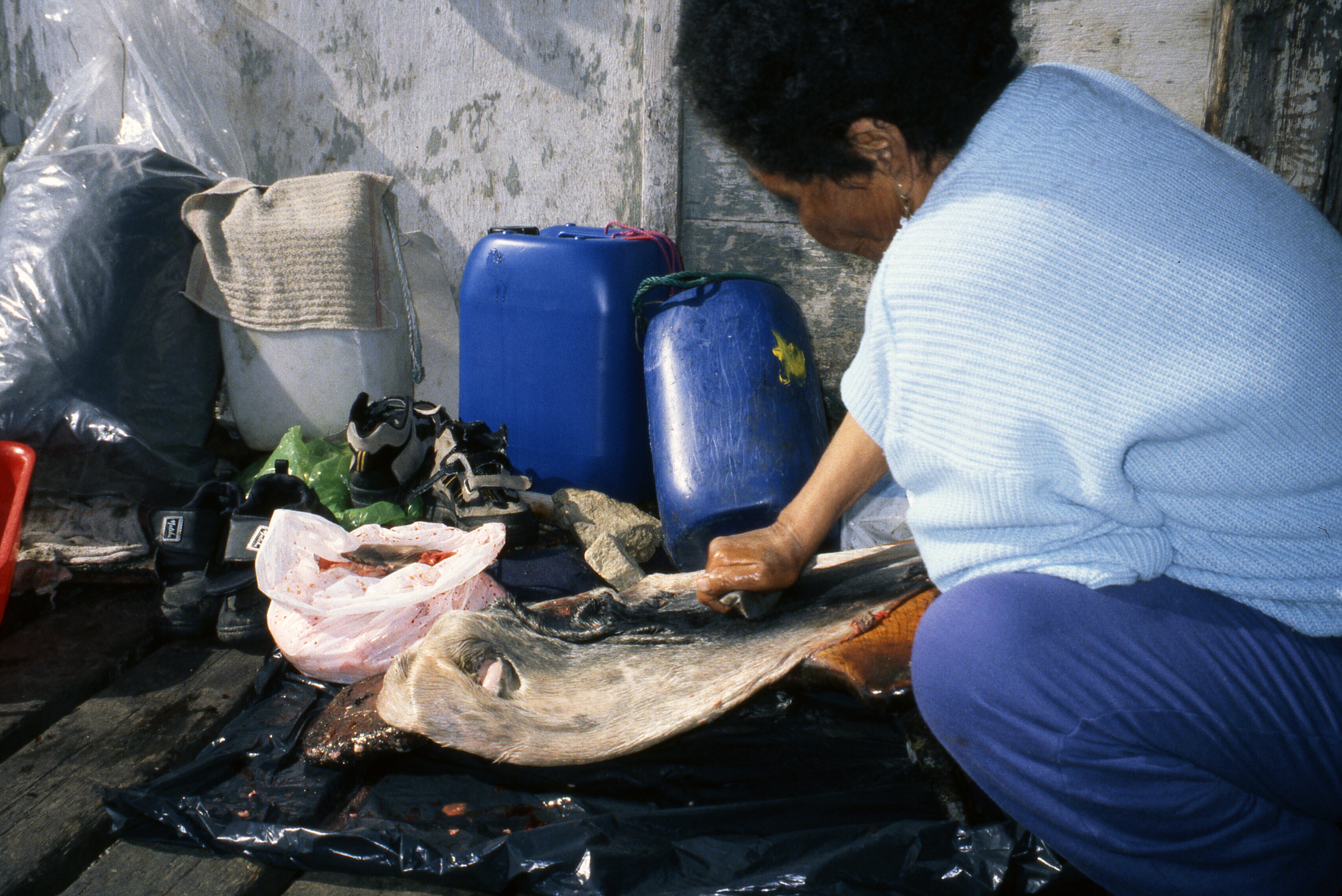 Buijs dia's 2001: Zeehondenhuid schrapen Asta Thomassen. Ulrike + kleinzoon (baby)