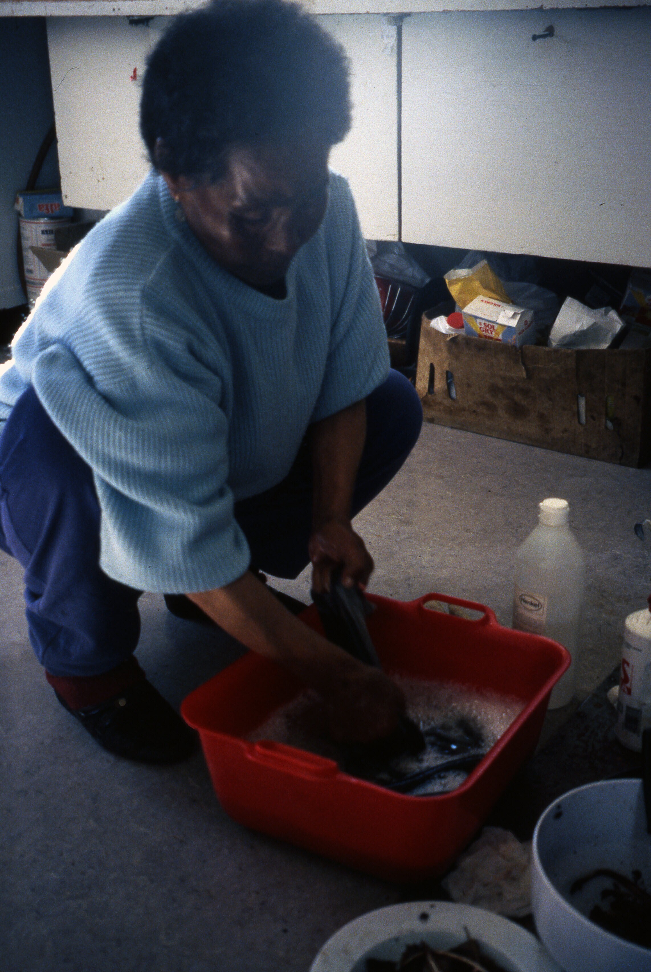 Buijs dia's 2001: Zeehondenhuid schrapen Asta Thomassen. Ulrike + kleinzoon (baby)