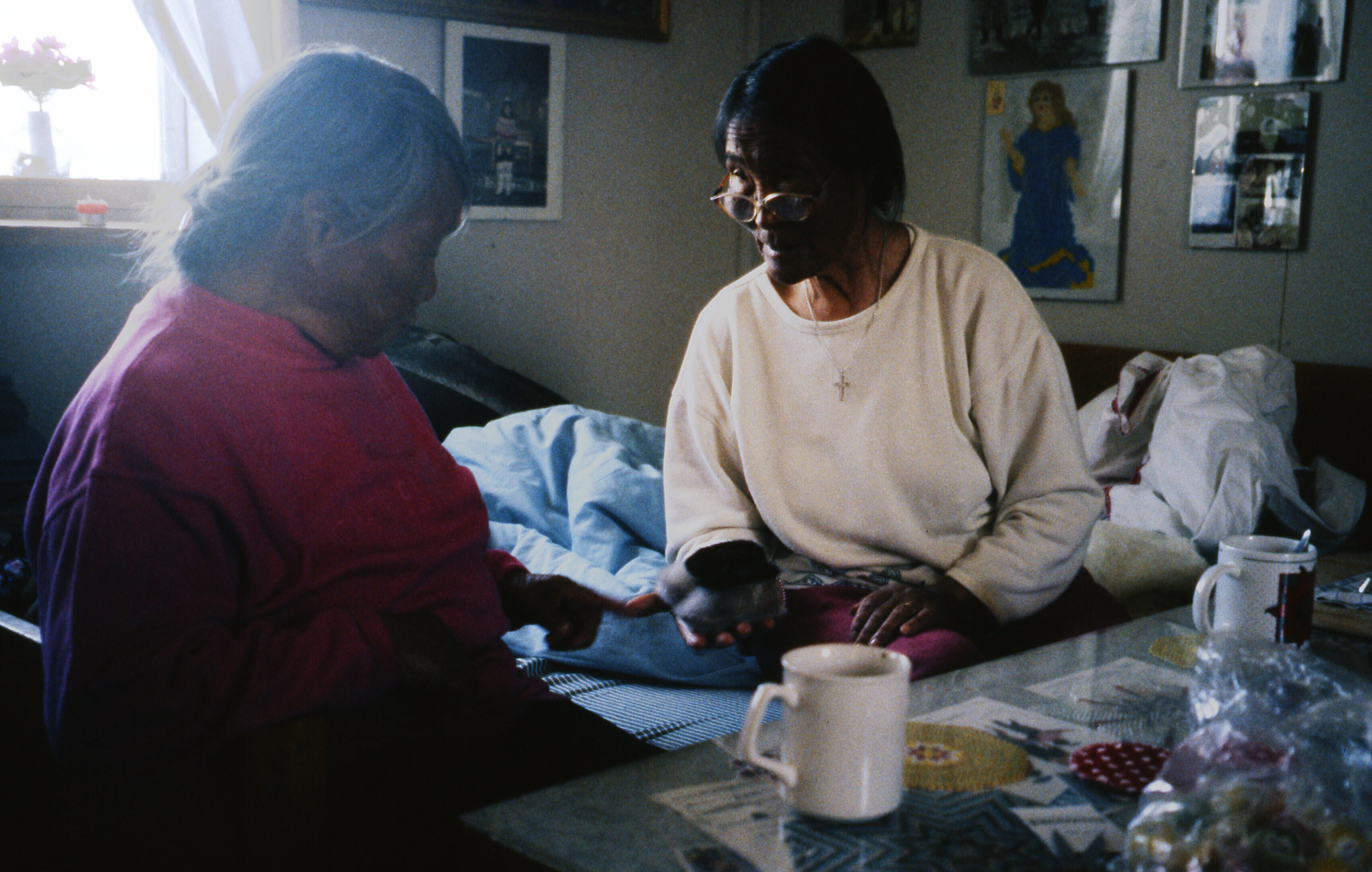 Buijs dia's 2001: Zeehondenhuid schrapen Asta Thomassen. Ulrike + kleinzoon (baby)