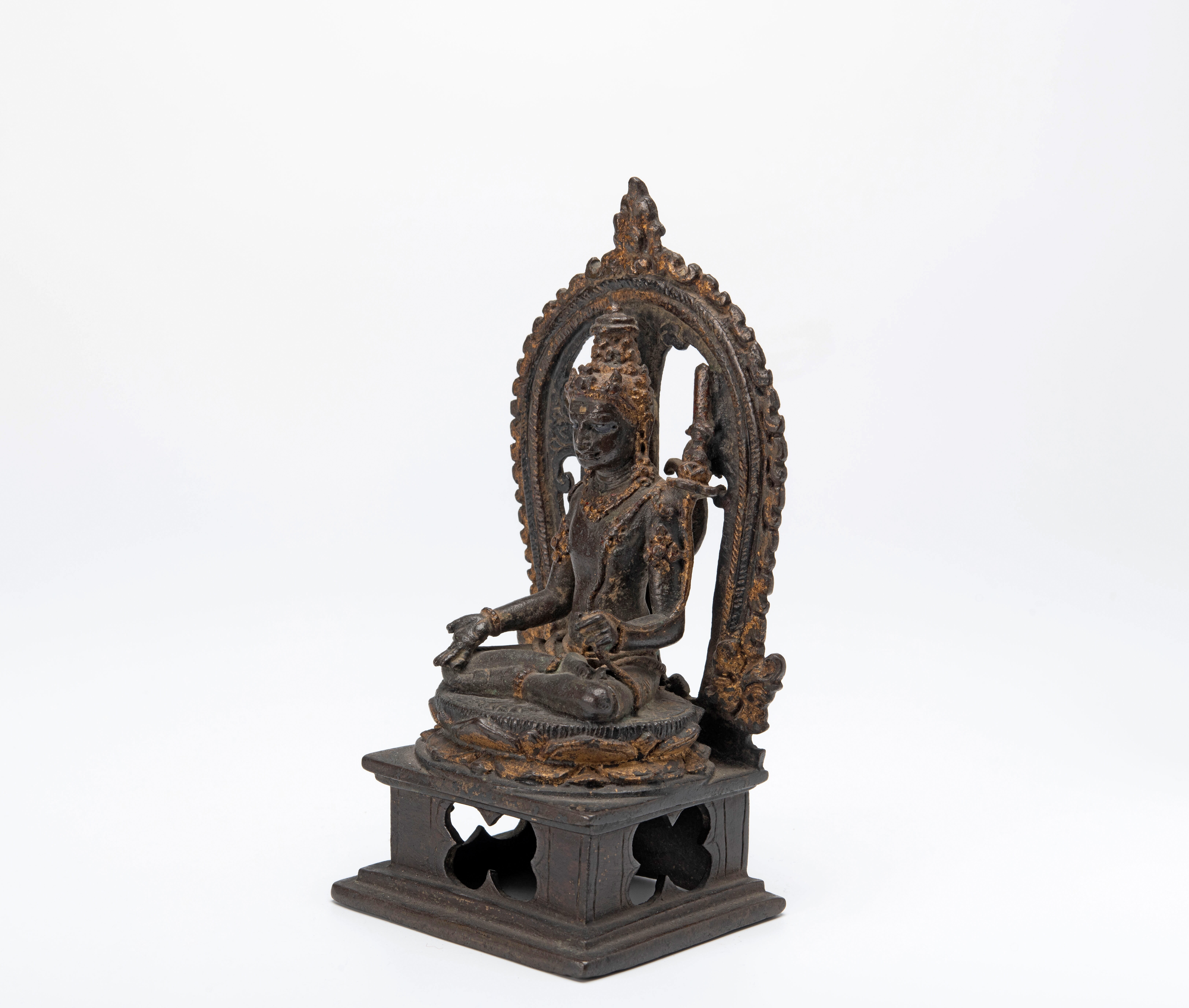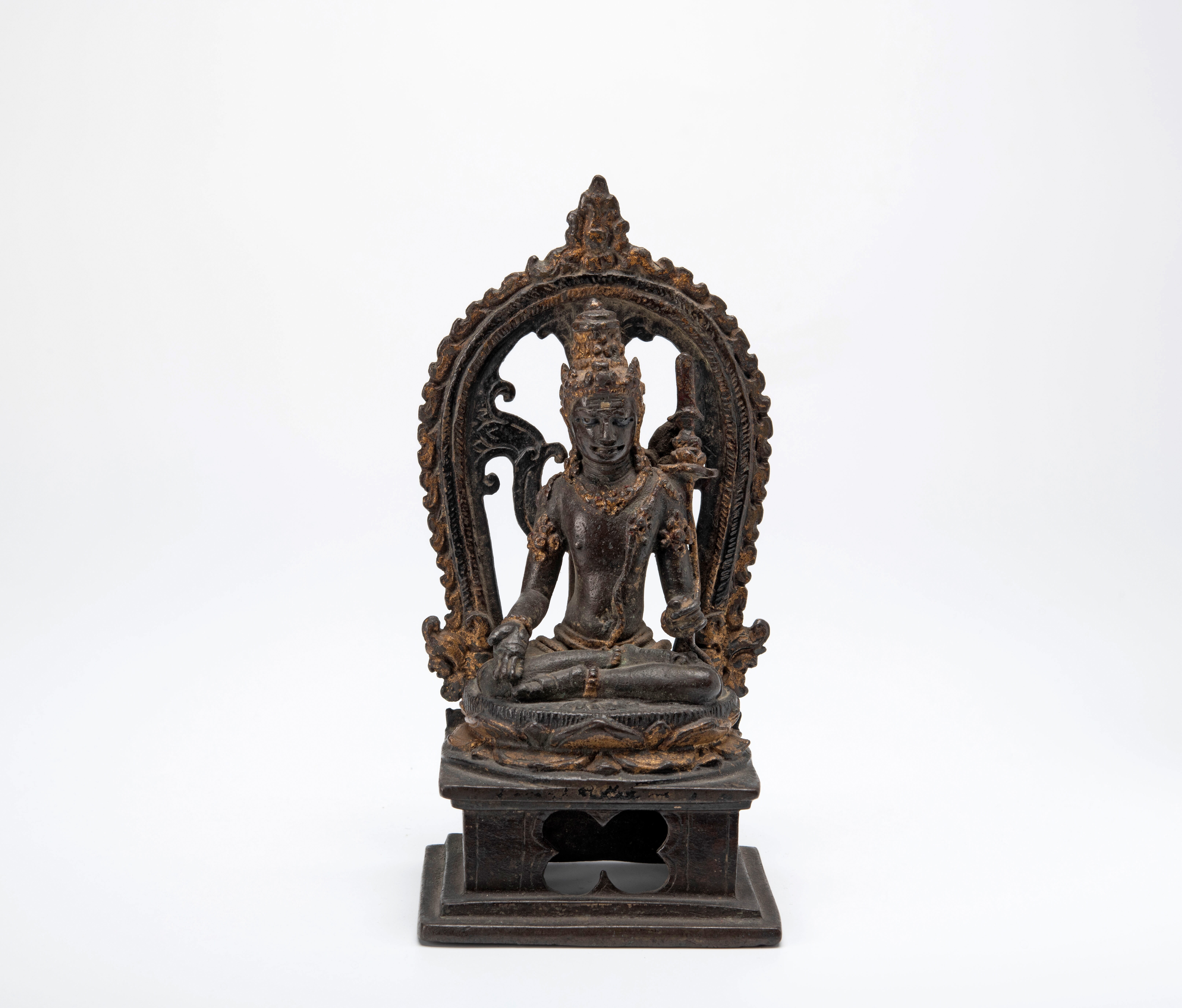 Dit beeldje heeft zijn rechterhand in de houding van geven, varada-mudra, en in zijn linkerhand een lotusbloem die tot zijn schouder oprijst. Op de lotus staat een zwaard. Het zwaard is een van de attributen die de Bodhisattva Manjushri kenmerkt. Het zou dus Manjushri kunnen zijn, maar meestal houdt die het zwaard in zijn hand ...