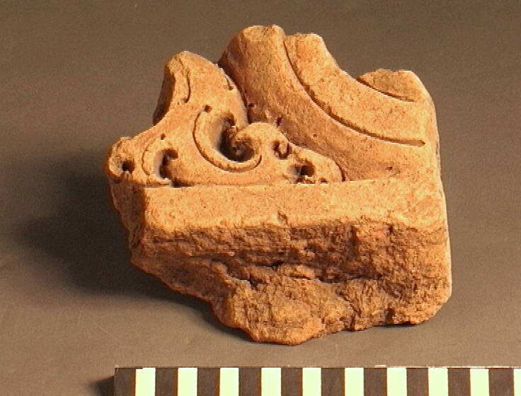 Baksteen van een bouwkundige versiering uit de Tjandi ruïnes bij Tanah Abang