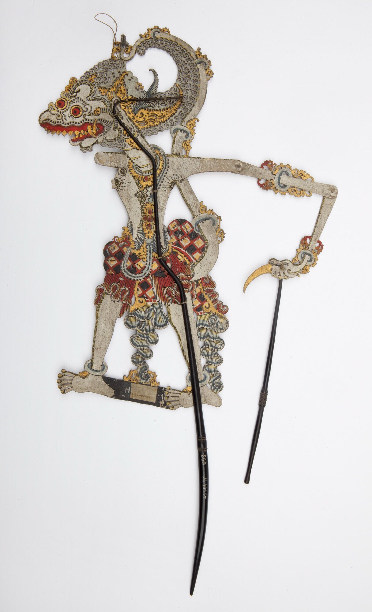 Deze wayang kulit pop stelt Hanoman voor. Hij behoort tot de groep ‘apen’ (para wanara) die een rol spelen in het wayang purwa repertoire - waarin onder andere verhalen als de Ramayana en de Mahabharata zijn opgenomen. Hanoman wordt weergegeven als een witte aap met kenmerken van Bayu. Zo heeft hij lange duimnagels (pancanaka) en ...