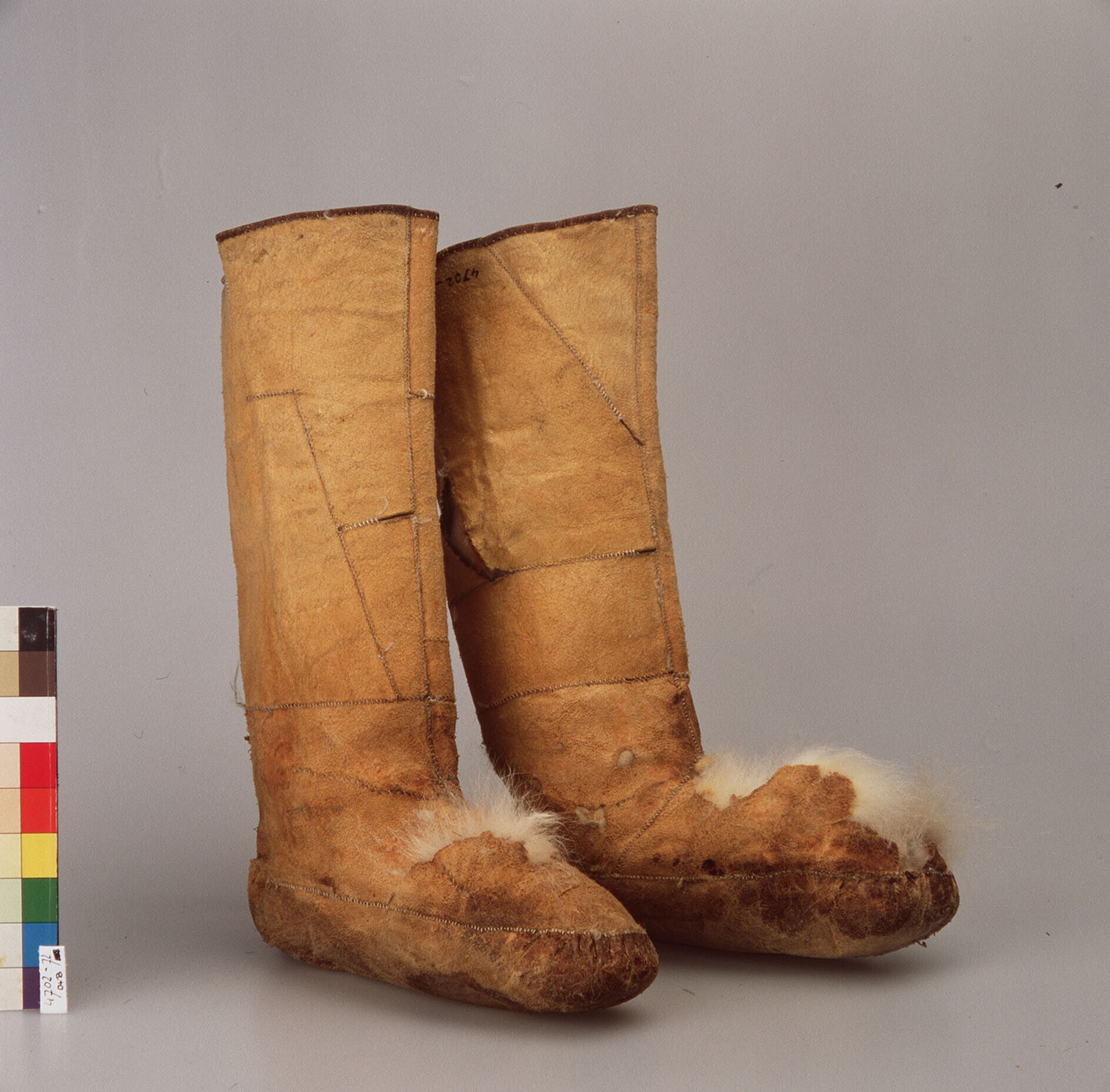 Boots made of sealskin from which the hair has been removed. The legs of both outer and inner boots are from the skin of the ringed seal. The soles are of bearded-seal skin. The feet of the inner boots are made from dog fur. The boots are sewn with nylon thread or line. A large ...