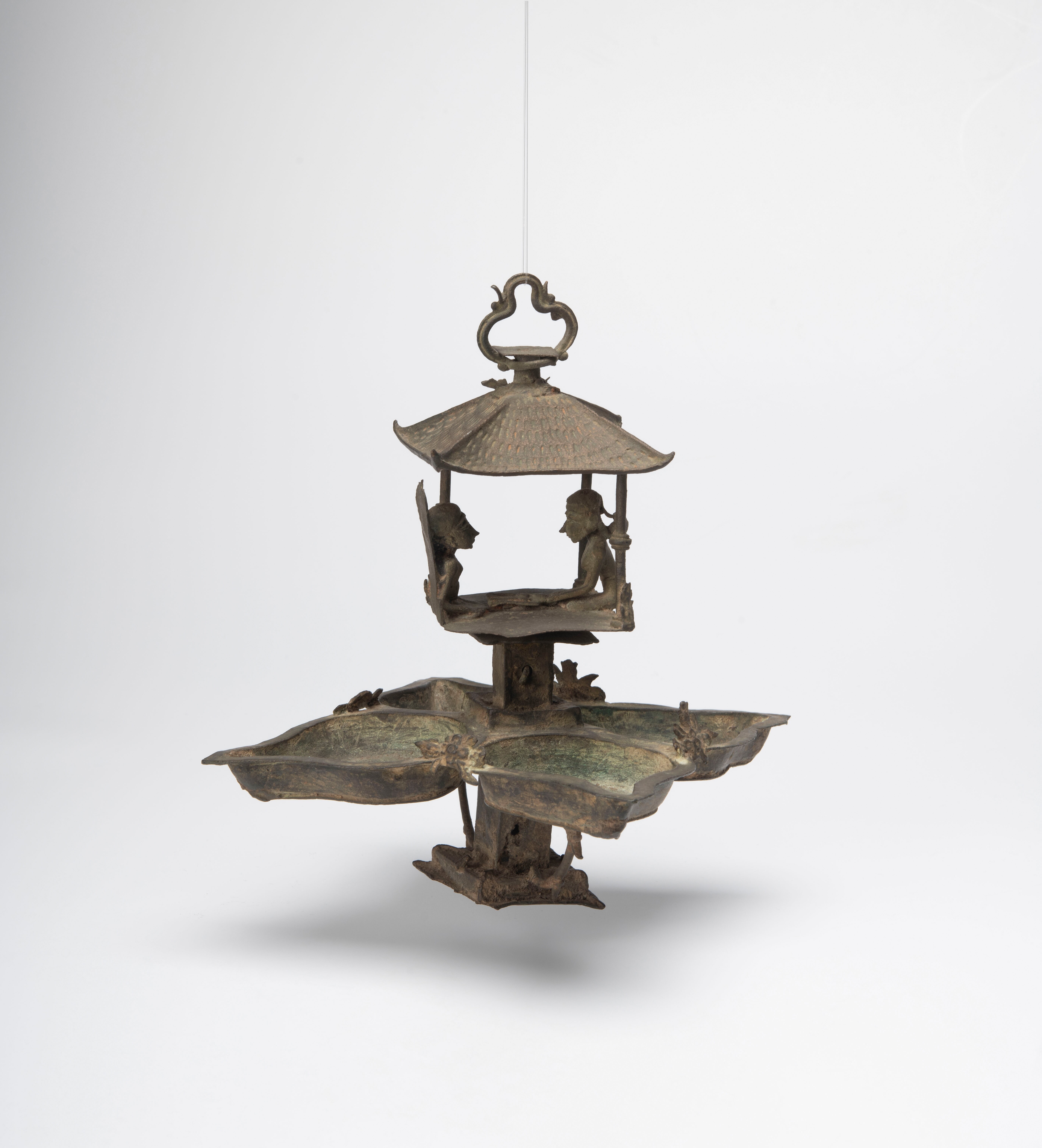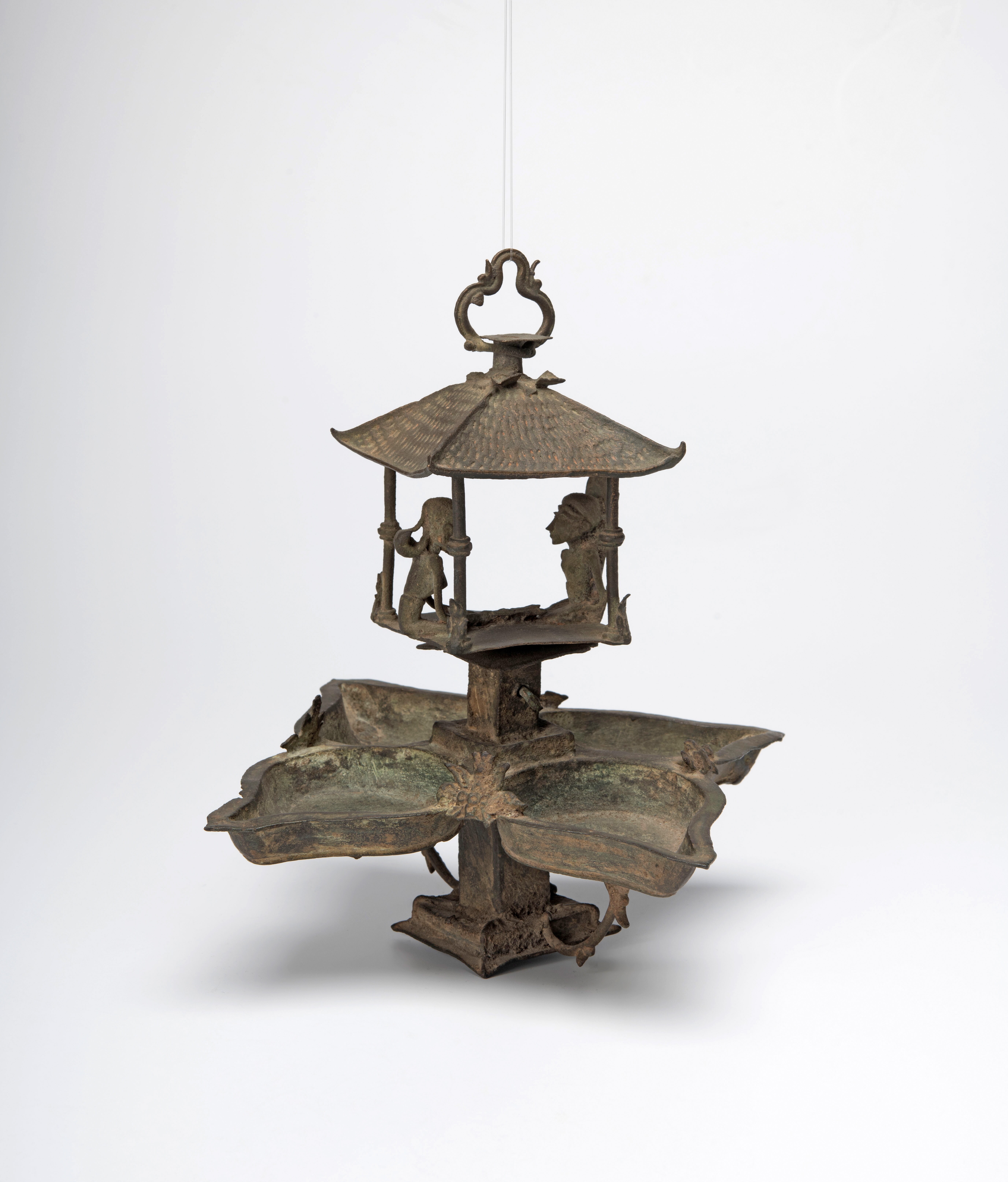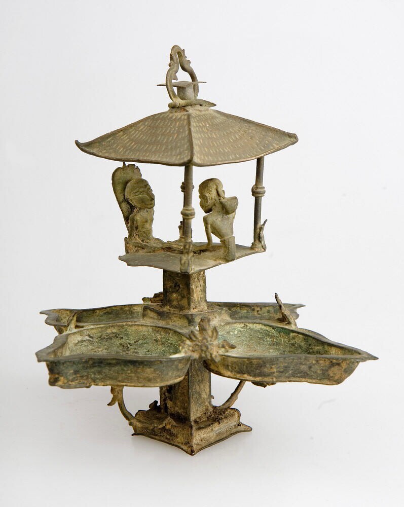 Lamp met vier oliereservoirtjes. In het midden een vierkante zuil met daarop een gebouwtje waarin een man en een vrouw tegenover elkaar zitten.