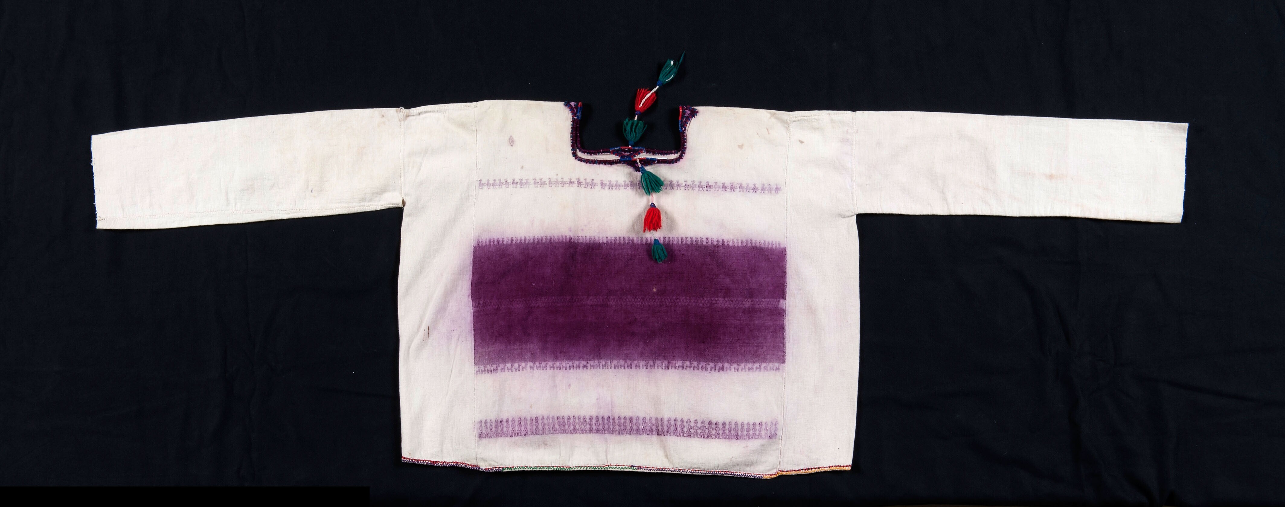 Handspun white cotton, plain weave with purple 'tuna' or 'fuchina' dye. Garment consists of three panels: one centre panel and two side panels, with sleeves attached to side panels. The centre panel has two purple woven-in cross bands (7x44 cm) on both back and front. These are separated by a narrow, 1 cm wide white ...
