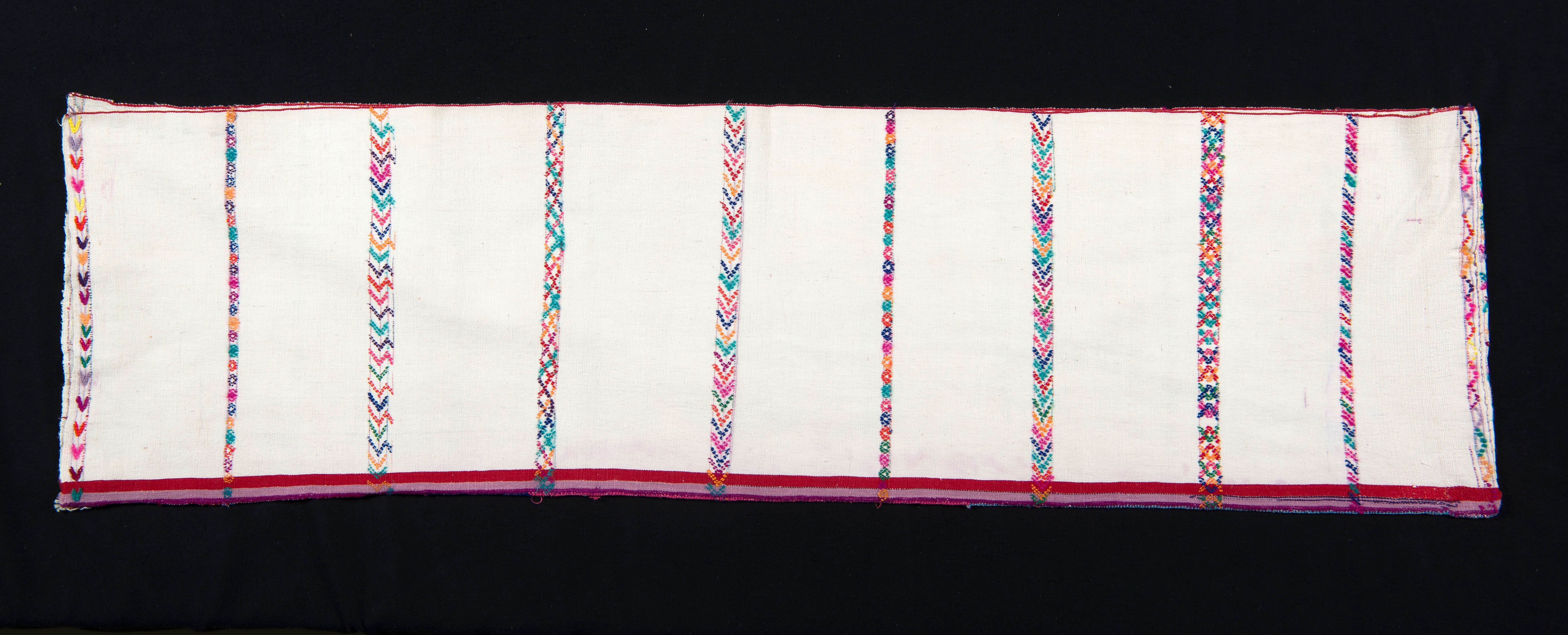 Handspun white cotton, plain weave with cross bands of multi-coloured brocading in commercial yarn, forming geometrical motifs. Cloth consists of two four-selvage webs and is stitched together at one short and one long side, latter has an opening producing an arm hole. At one end the long side has red and purple warp stripes. Used ...
