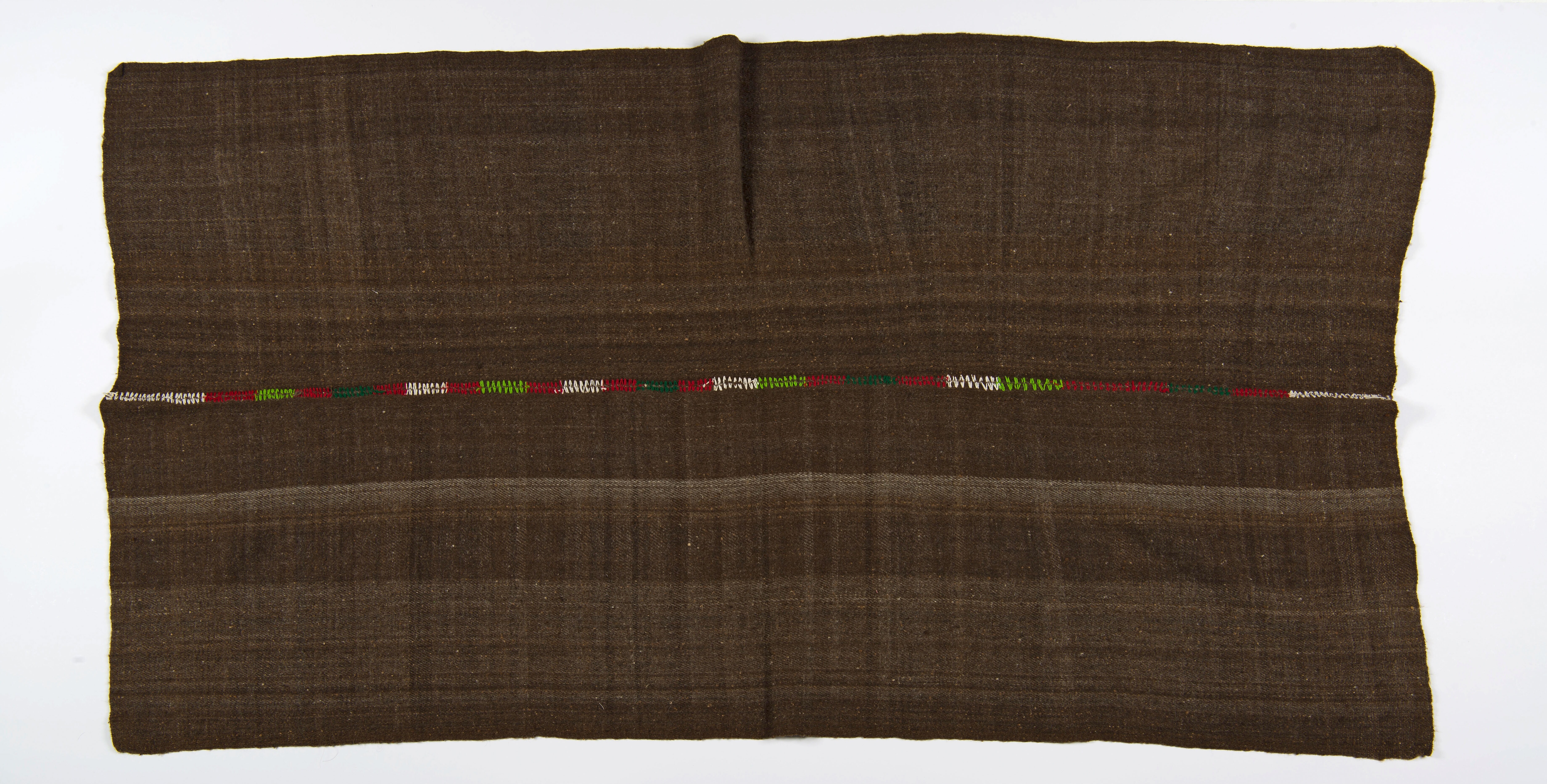 Handspun brown wool, plain weave. Two four-selva­ge webs are stitched together with multi-coloured 'randa' work. The extra width is turned down inside for more warmth.