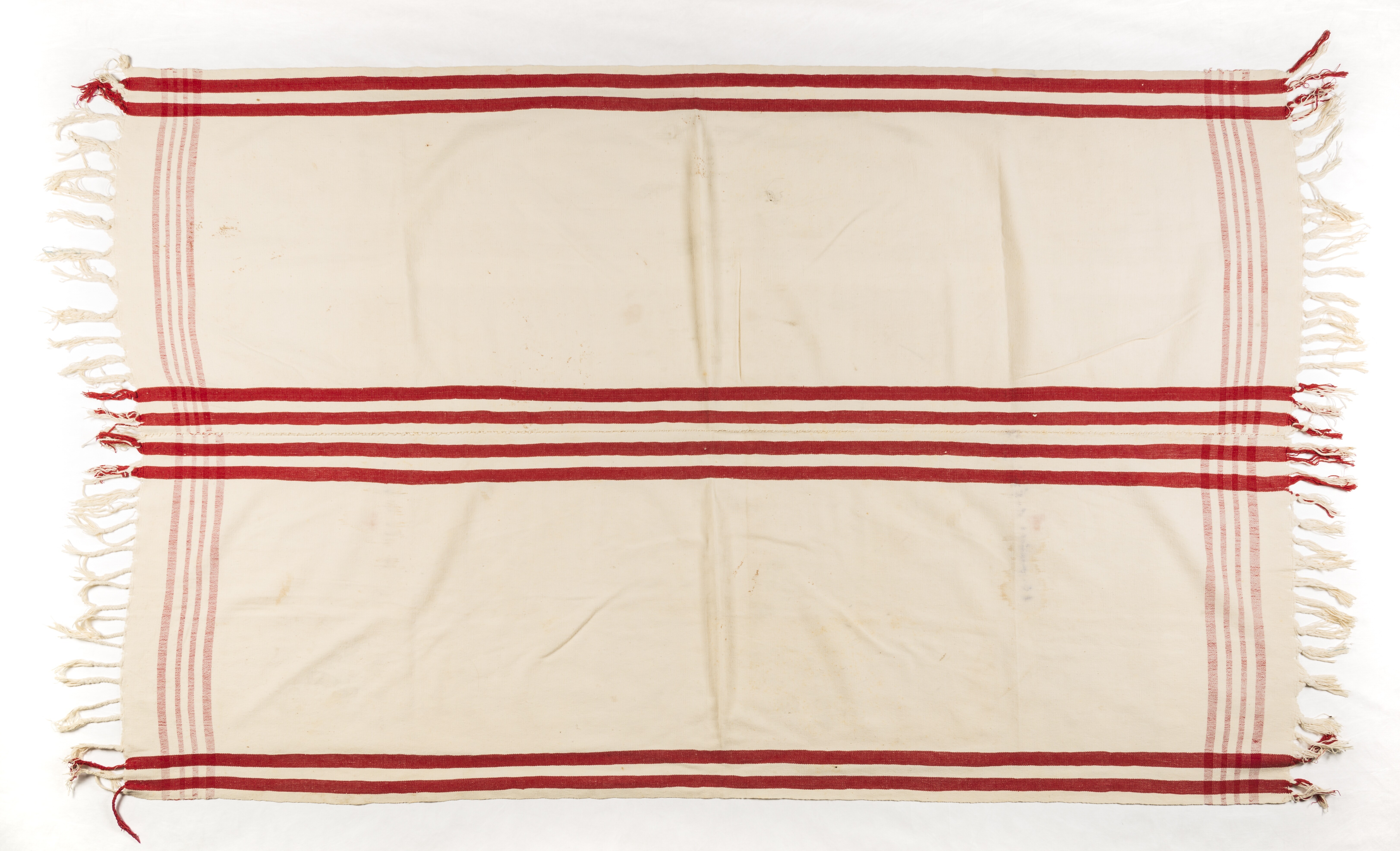 Two handspun cotton panels with two red warp stripes on both sides sewn together. On both ends four less apparent red weft stripes and on both ends tassels. Woven on backstrap loom in Copala. Used as cover by men and women in Copala.