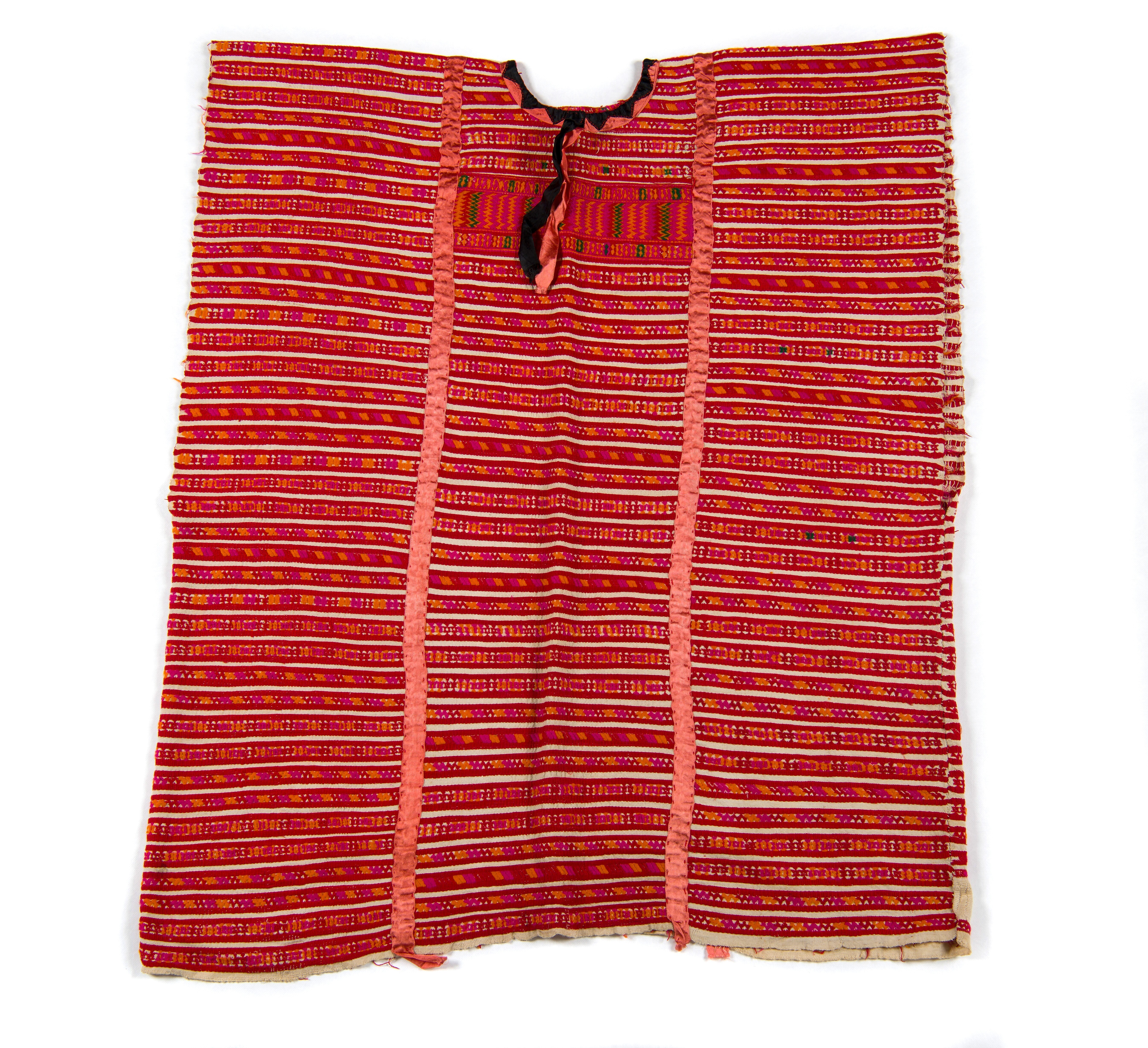 Handspun white cotton, plain weave. Cross bands, predominantly red with some pink, orange and green, of commercial yarn, brocaded all over the garment. Superstructural patterning: a variation of weft-brocading, namely a combination of onlay and wrapped brocading; laborious and slow work; numerous short lengths of coloured strands used to build up design motifs (c.i.B.C.). The ...
