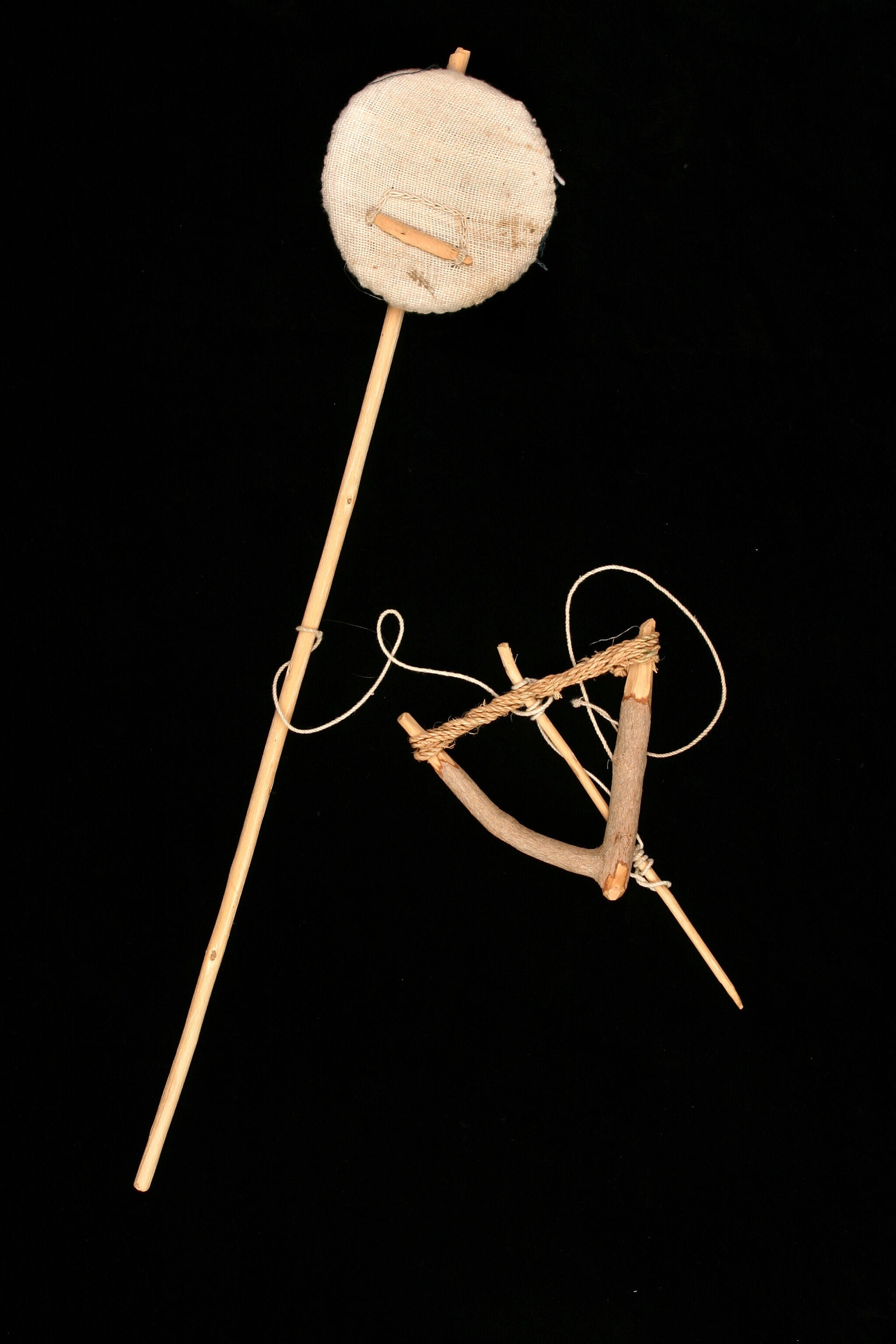 Children hunt with a bird trap. If a bird stands on the round plate, the trap snaps shut, pulling the string tight around the bird’s leg.