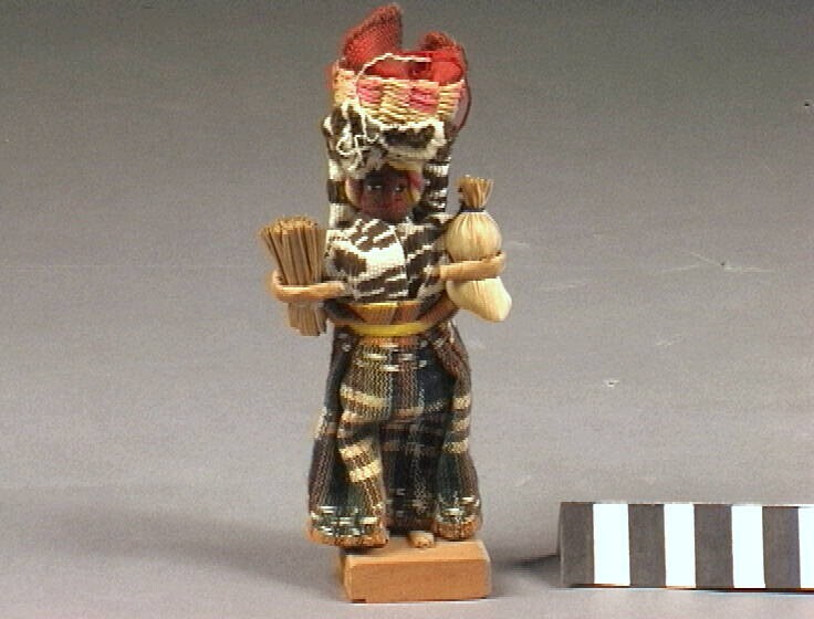 Popje van een vrouw met een mand op haar hoofd en een zak in haar hand