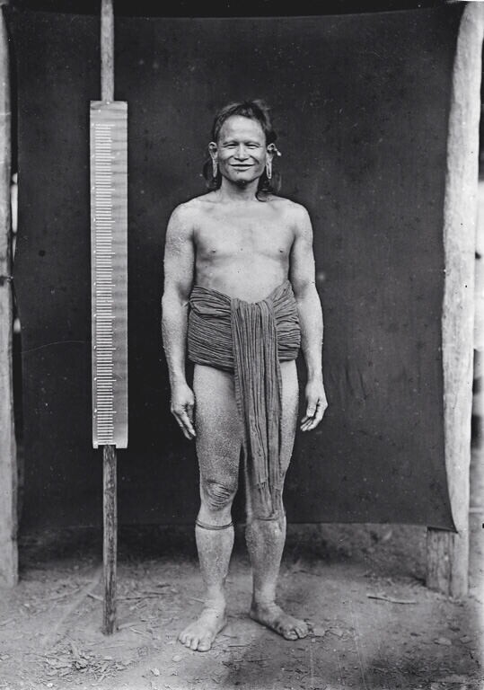 Portret van hoofd der Pnihing Dajaks van Long Kup
