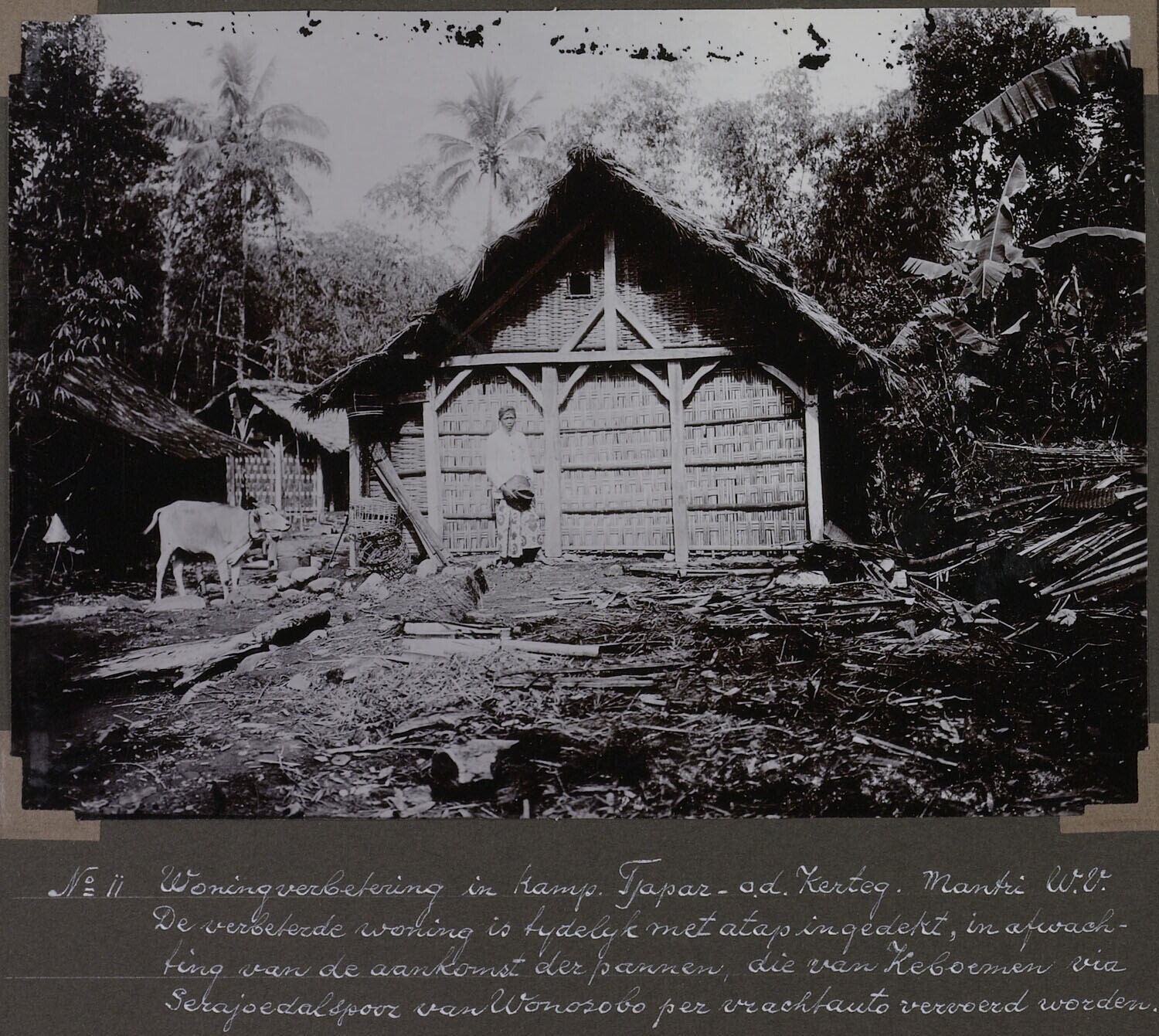 'Woningverbetering in kamp Tjapar o.d. Kerteg. Mantri W.V. De verbeterde woning is tijdelijk met atap ingedekt, in afwachting van de aankomst der pannen die van Keboemen via Serajoedalspoor van Wonosobo per vrachtauto vervoerd worden.'