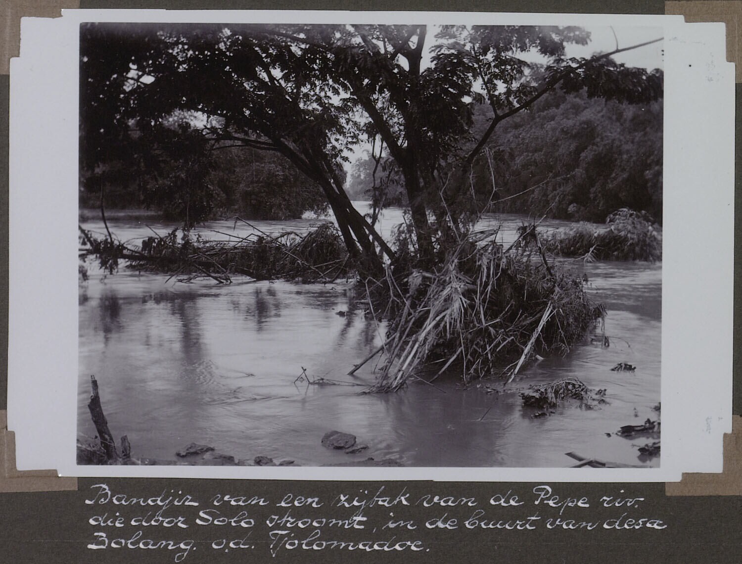 'Bandjir van een zijtak van de Pepe rivier die door Solo Stroomt in de buurt van desa Bolang o.d. Tjolomadoe.'