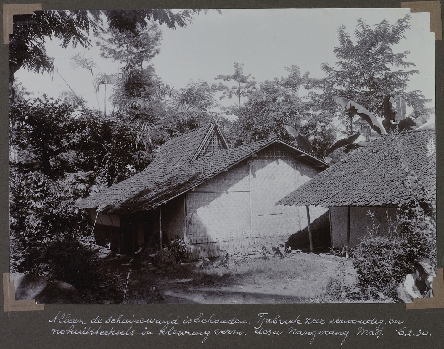 'Alleen de schuine wand is behouden. Tjabriek zeer eenvoudig en nokuitsteeksels in klewang vorm. Desa Nangerang, Madjalengka.'