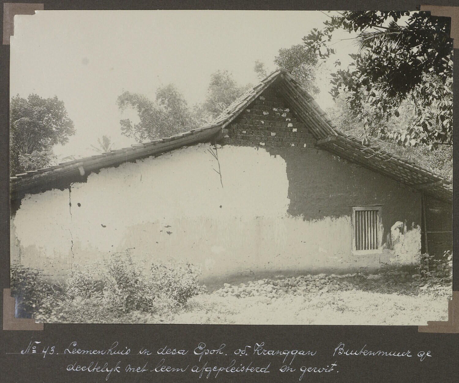 'Leemenhuis in desa Epoh o.d. Kranggan. Buitenmuur gedeeltelijk met leem afgepleisterd en gewit.'