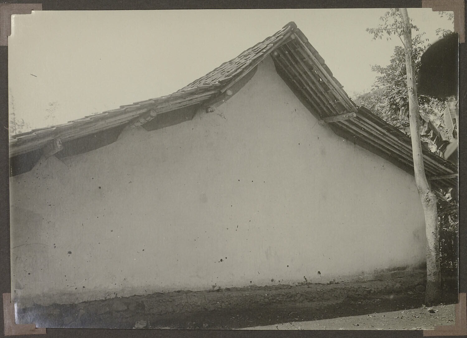 'Verbeterde leemenwoningen te Kowangan o.d. Temanggoeng. De zware bamboe's zijn gestopt met een cement prop.'