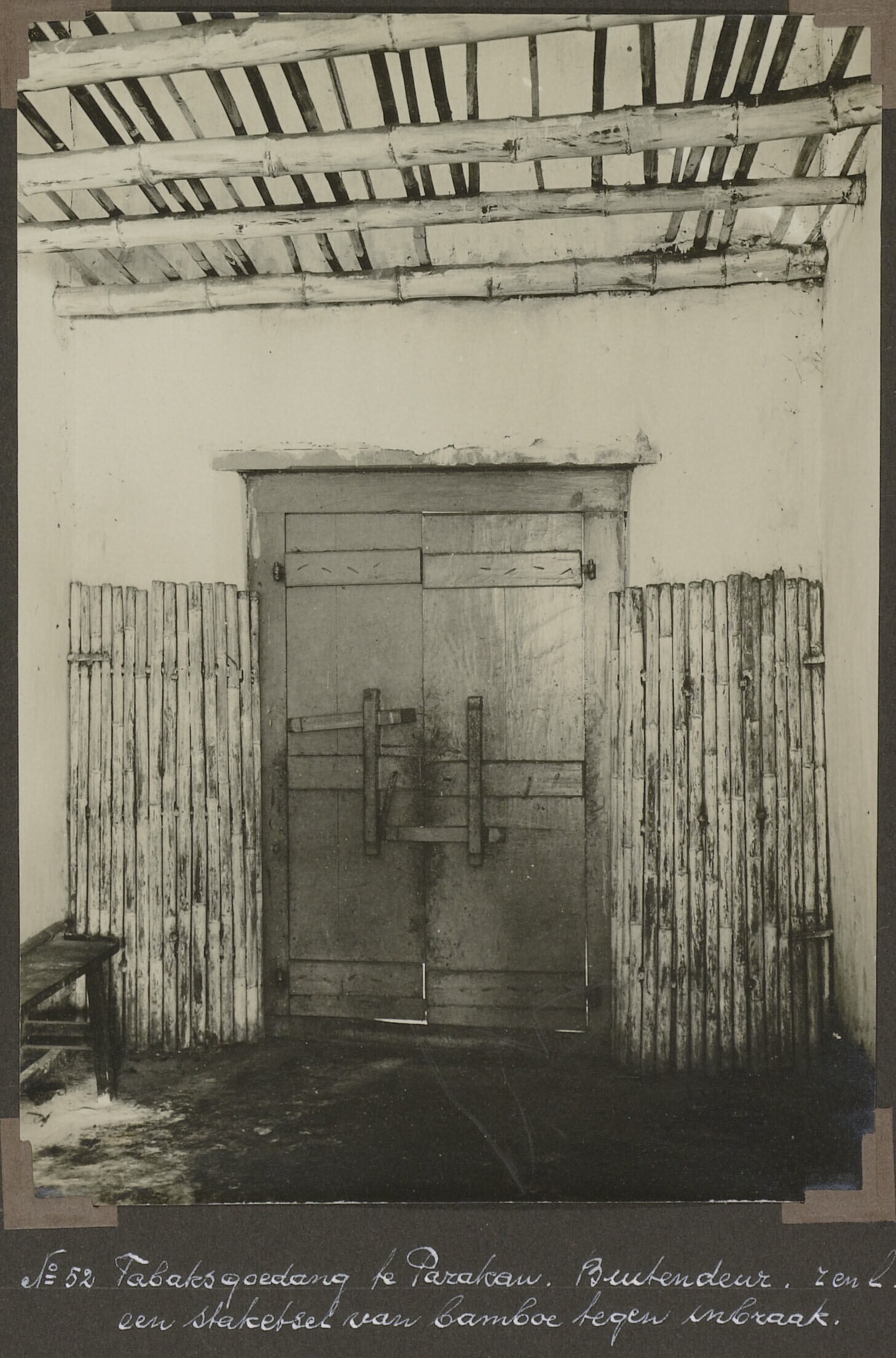 'Tabaksgoedang te Parakan. Buitendeur rechts en links een staketsel van baboe tegen inbraak.'