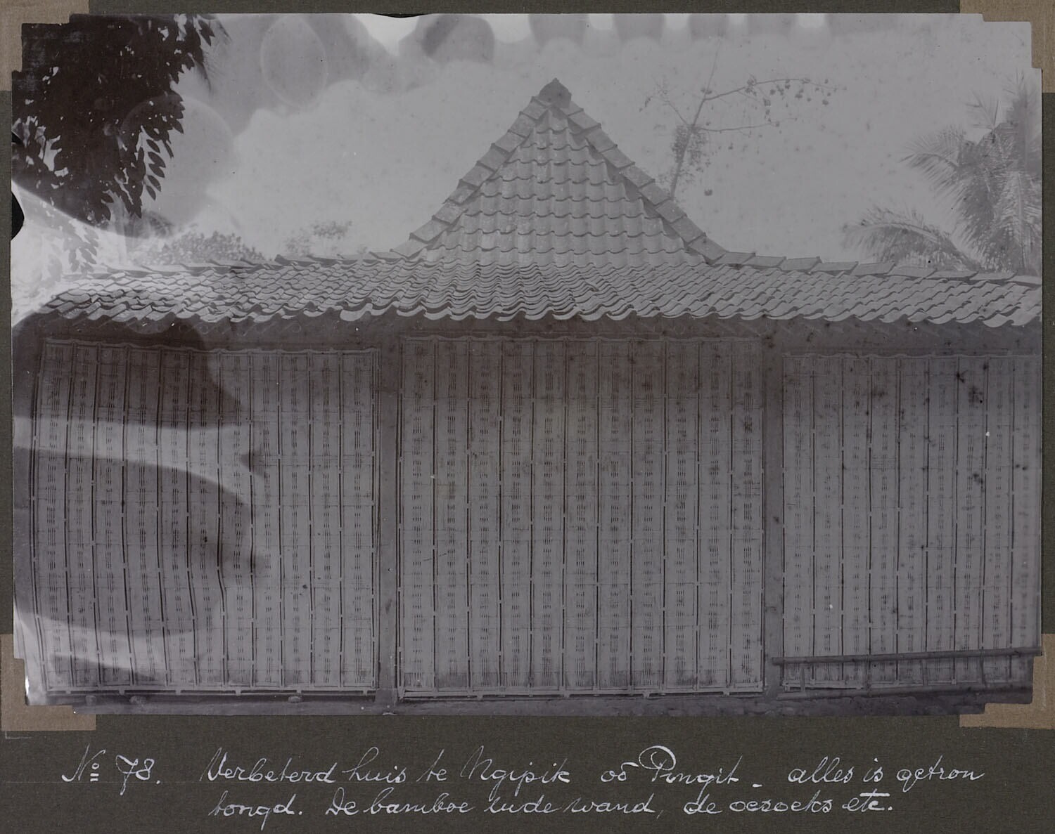'Verbeterd huis te Ngipik o.d. Pingit. Alles is getrontongd. De bamboe in de wand, de oesoeks etc.'