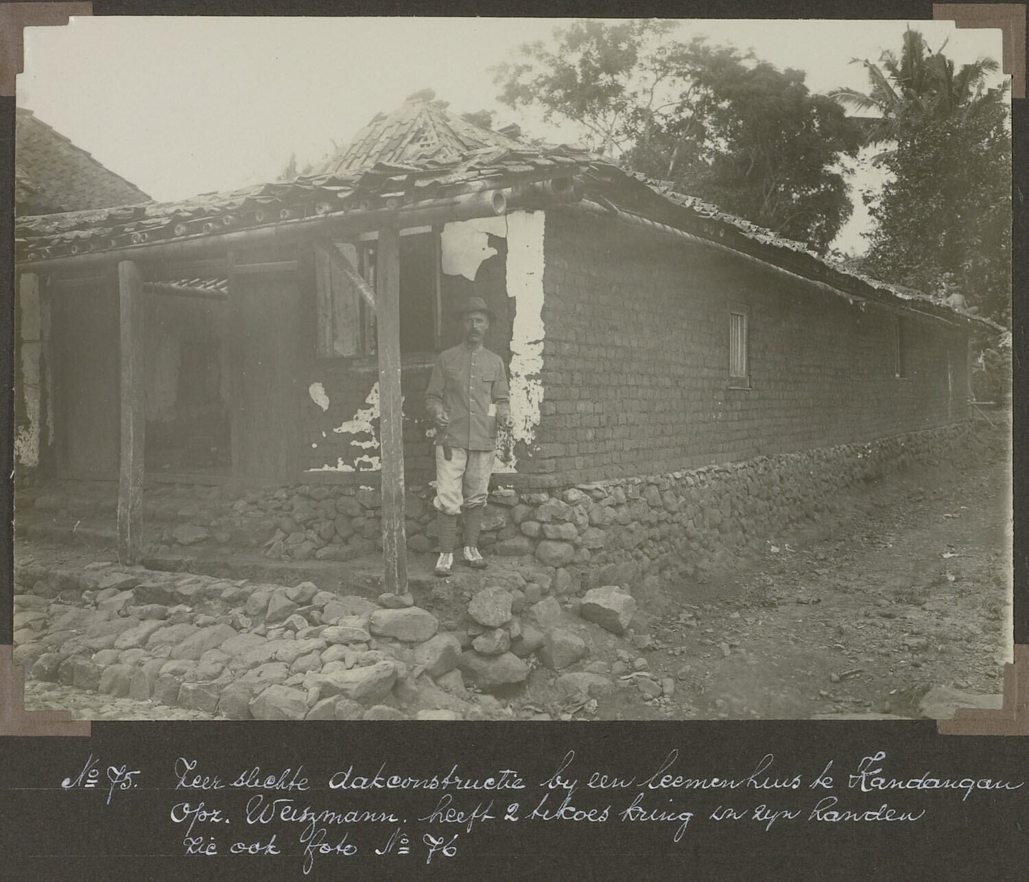 'Zeer slechte dakconstructie bij een leemenhis te Kandangan Opz. Weiszmann. Heeft twee tekoes kring in zijn handen.'