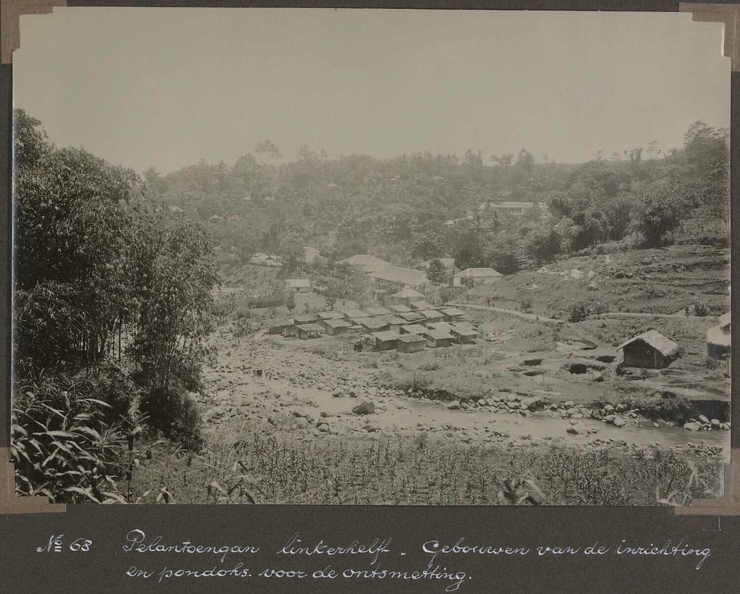 'Pelantoengan linkerhelft. Gebouwen van de inrichting en pondoks voor de ontsmetting.'