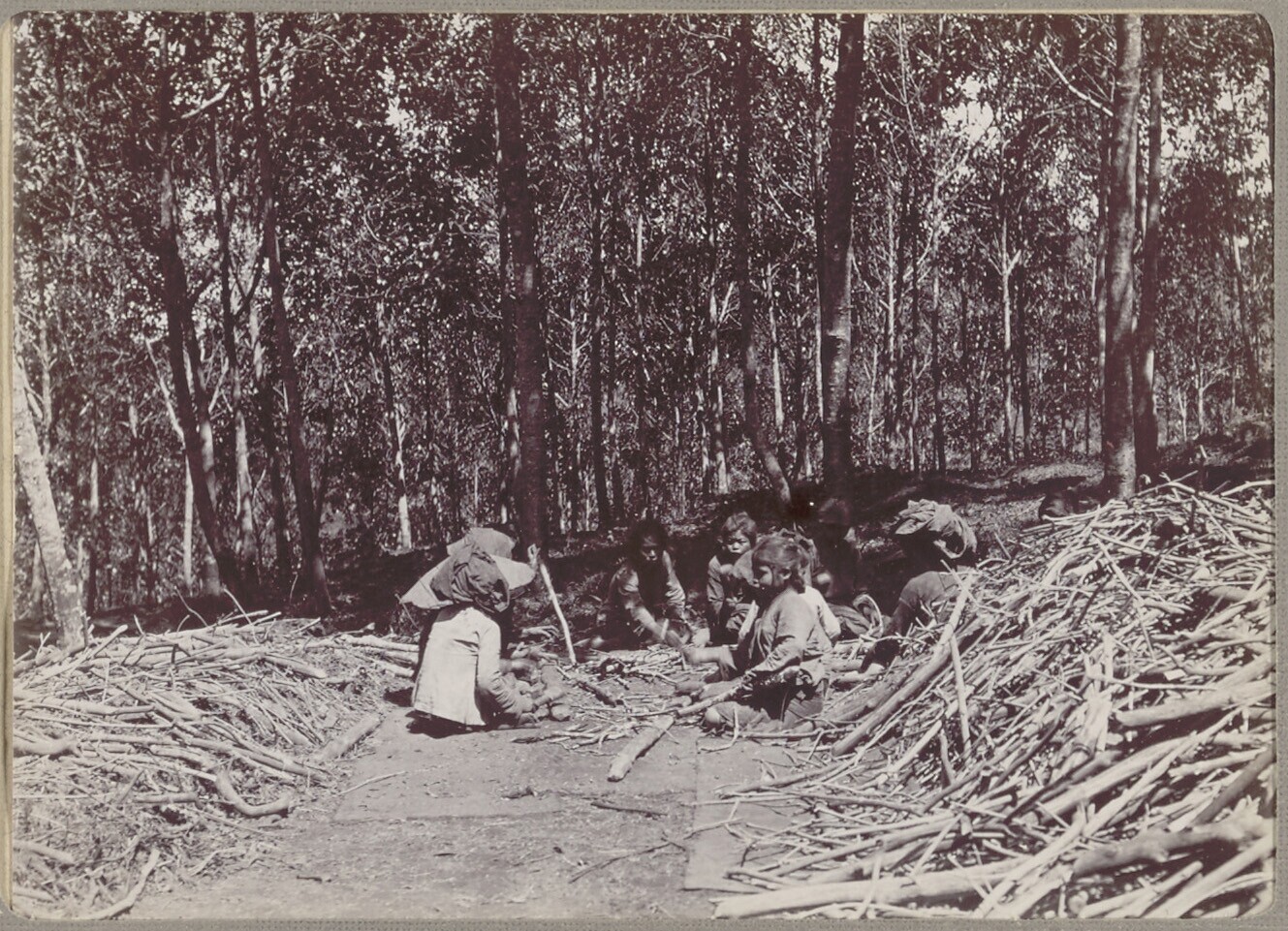 Groep Javaanse arbeiders houdt rust temidden van gesnoeide takken en sprokkelhout tijdens werkzaamheden in bos