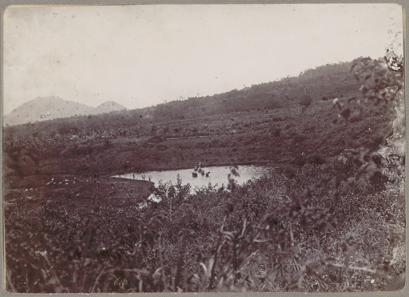 Landschap met kleine waterpartij en gebergte op de achtergrond