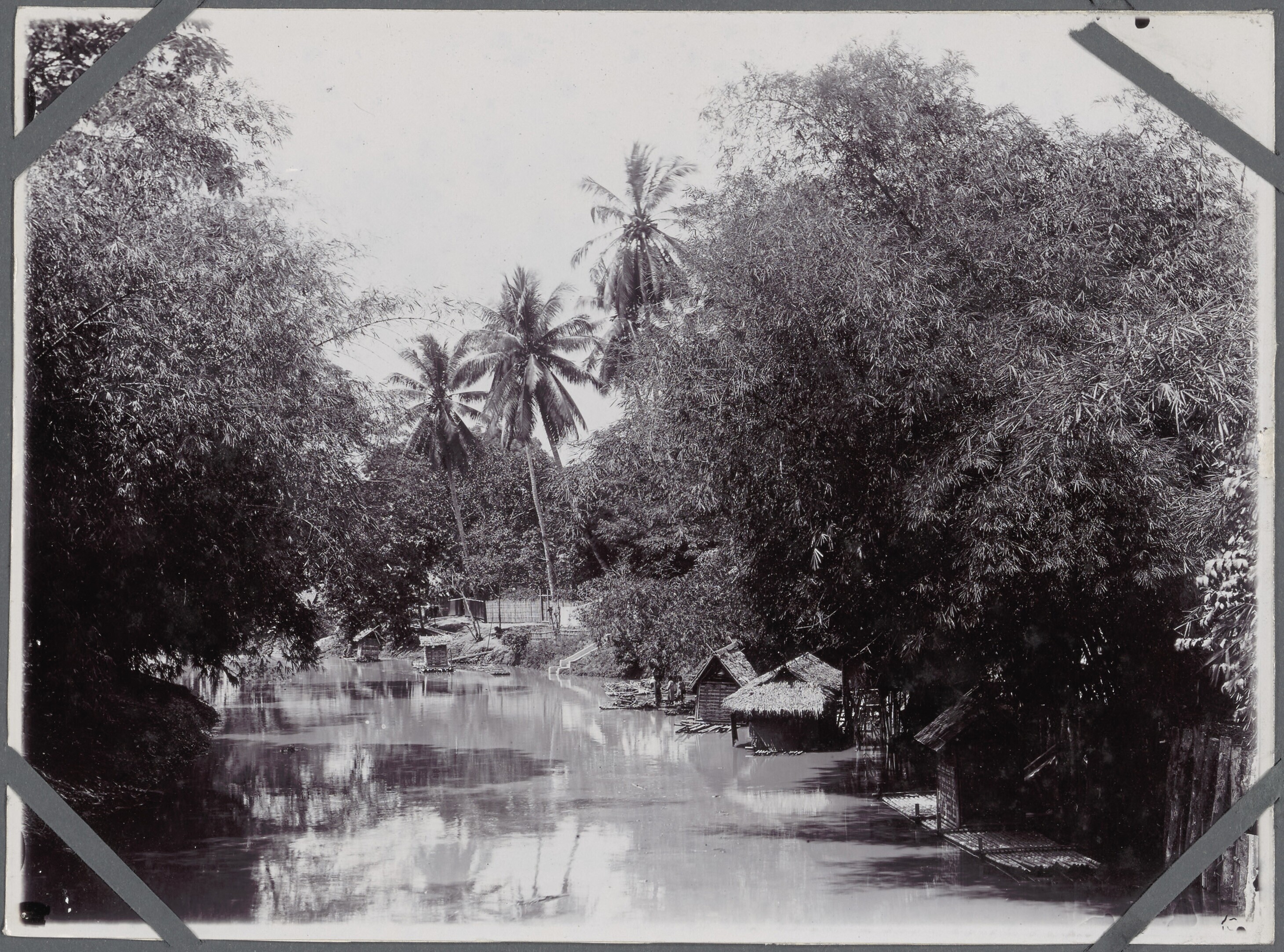 Rivier met bamboe aan weerskanten en bebouwing aan de rechterzijde