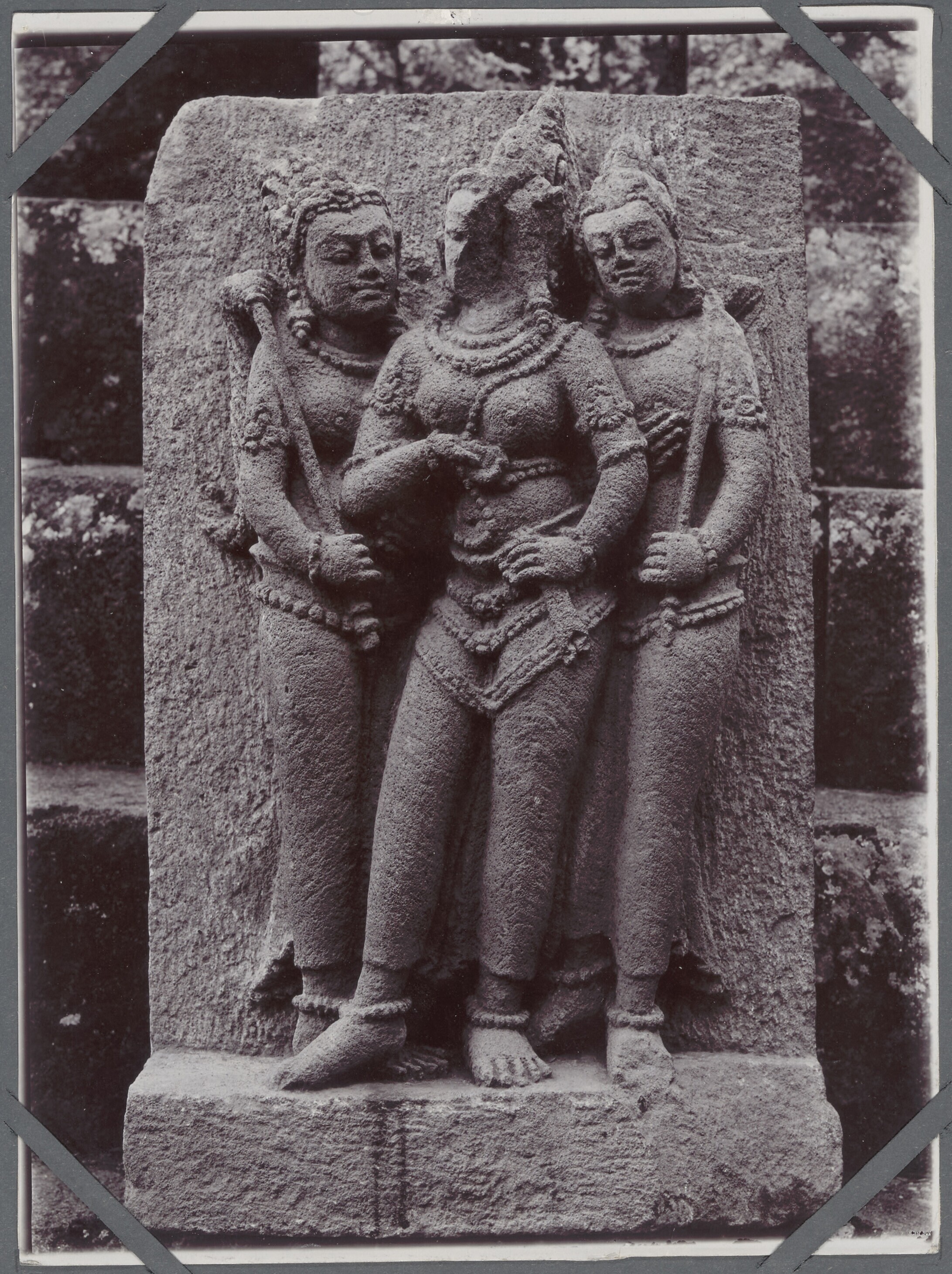 Sculptuur van drie vrouwenfiguren in reliëf