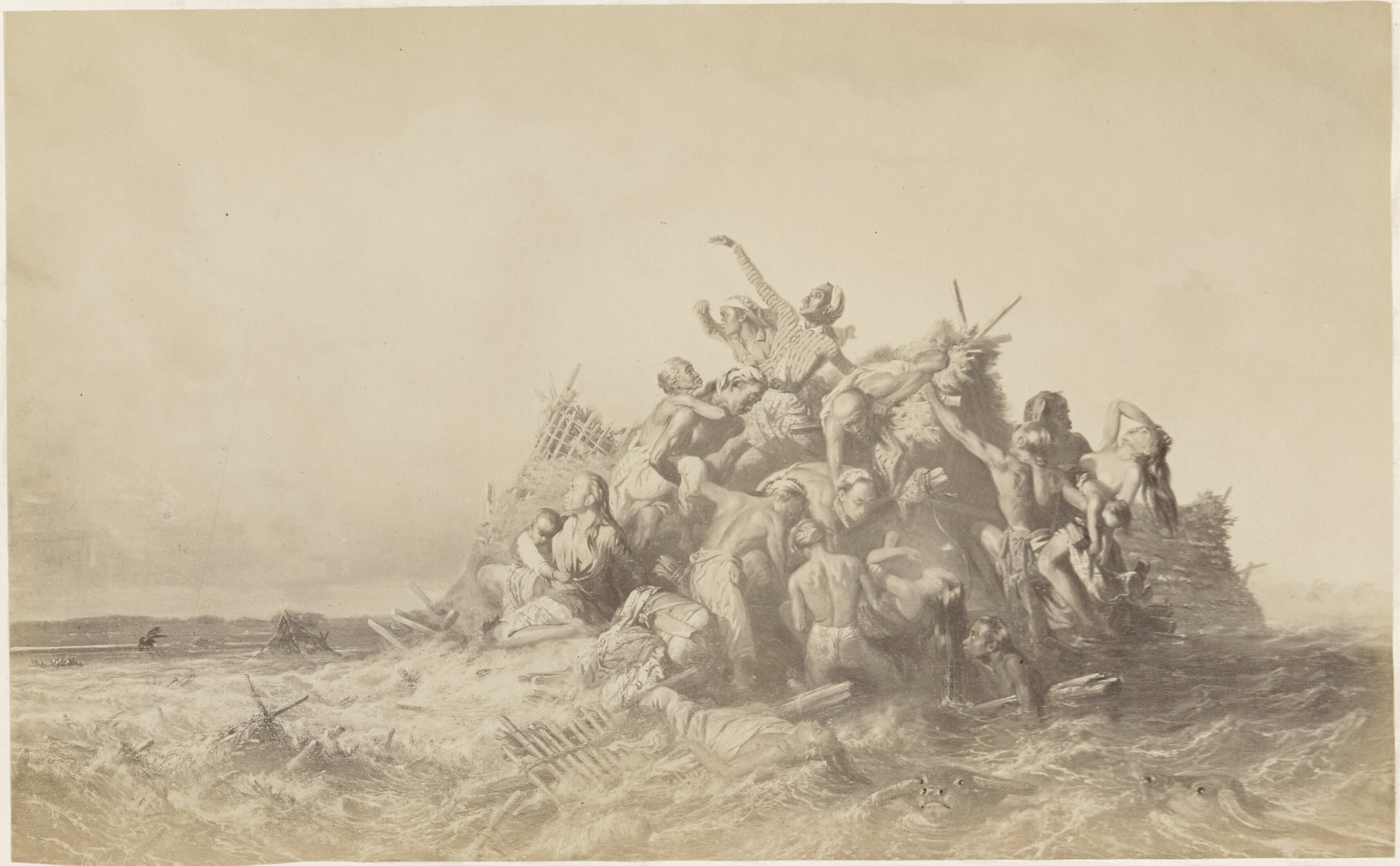 Een foto van een schilderij van Raden Saleh voorstellend een vloedgolf op Java