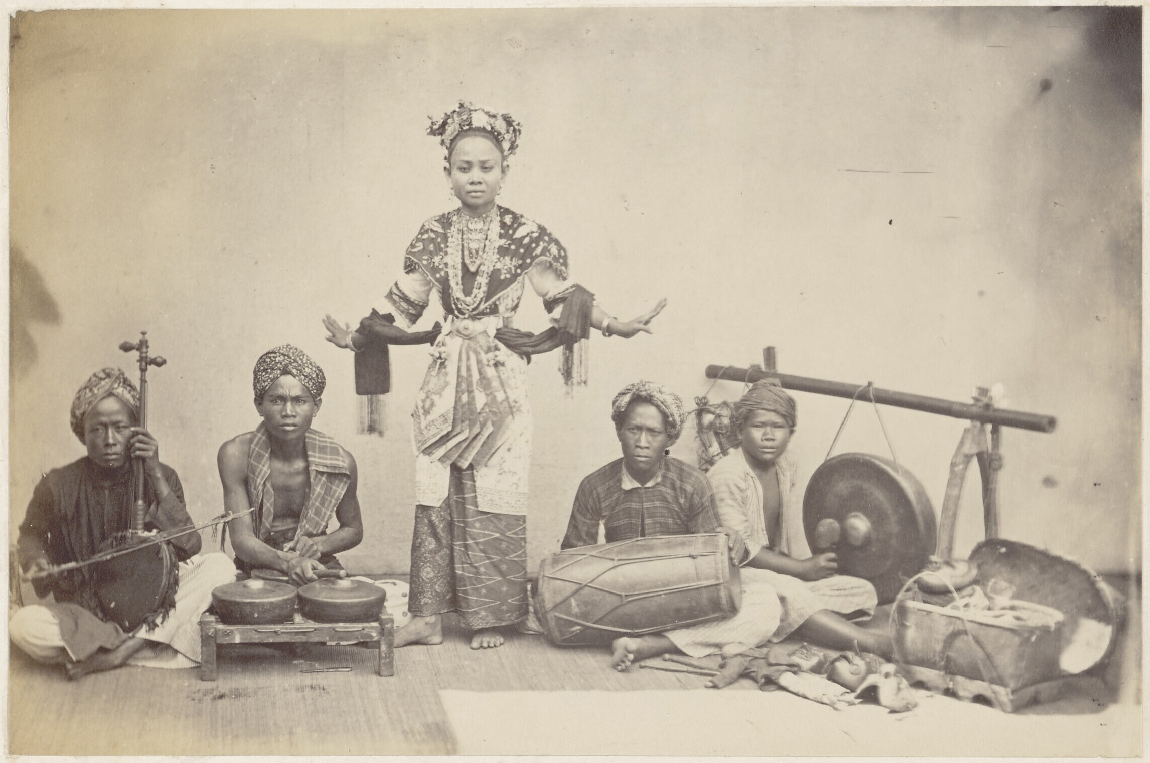 Een publieke danseres onder begeleiding van een klein gamelanorkest