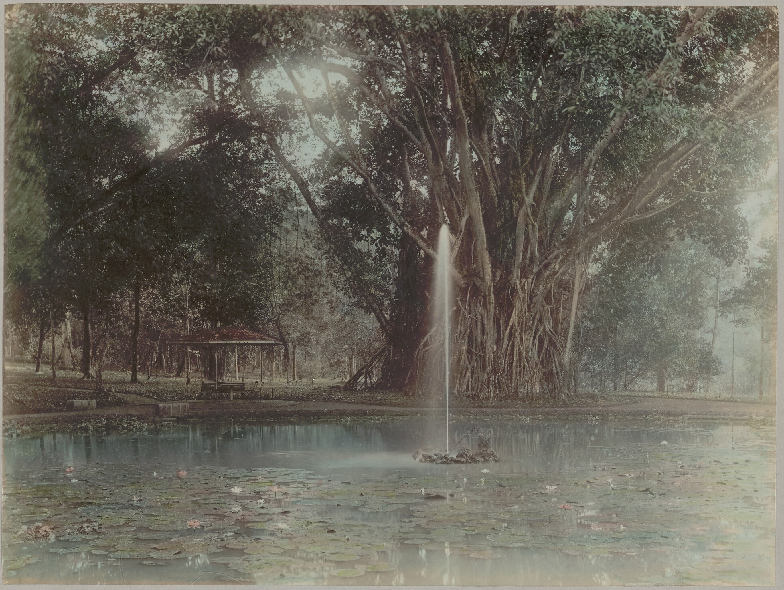 Vijver met fontein en en guttaperchaboom in 's Lands Plantentuin te Buitenzorg, West-Java