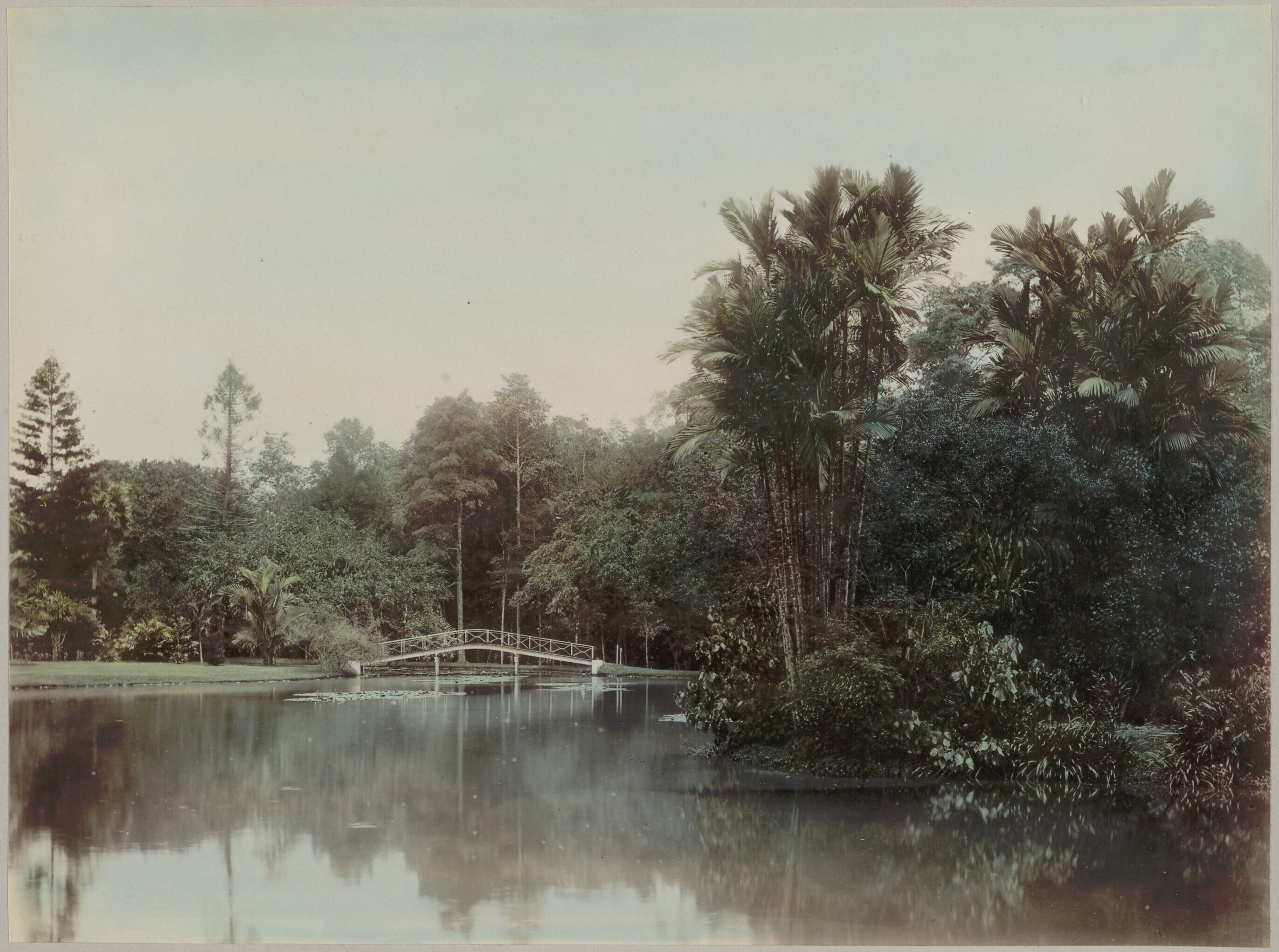 De grote vijver met brug in 's Lands Plantentuin te Buitenzorg op West-Java