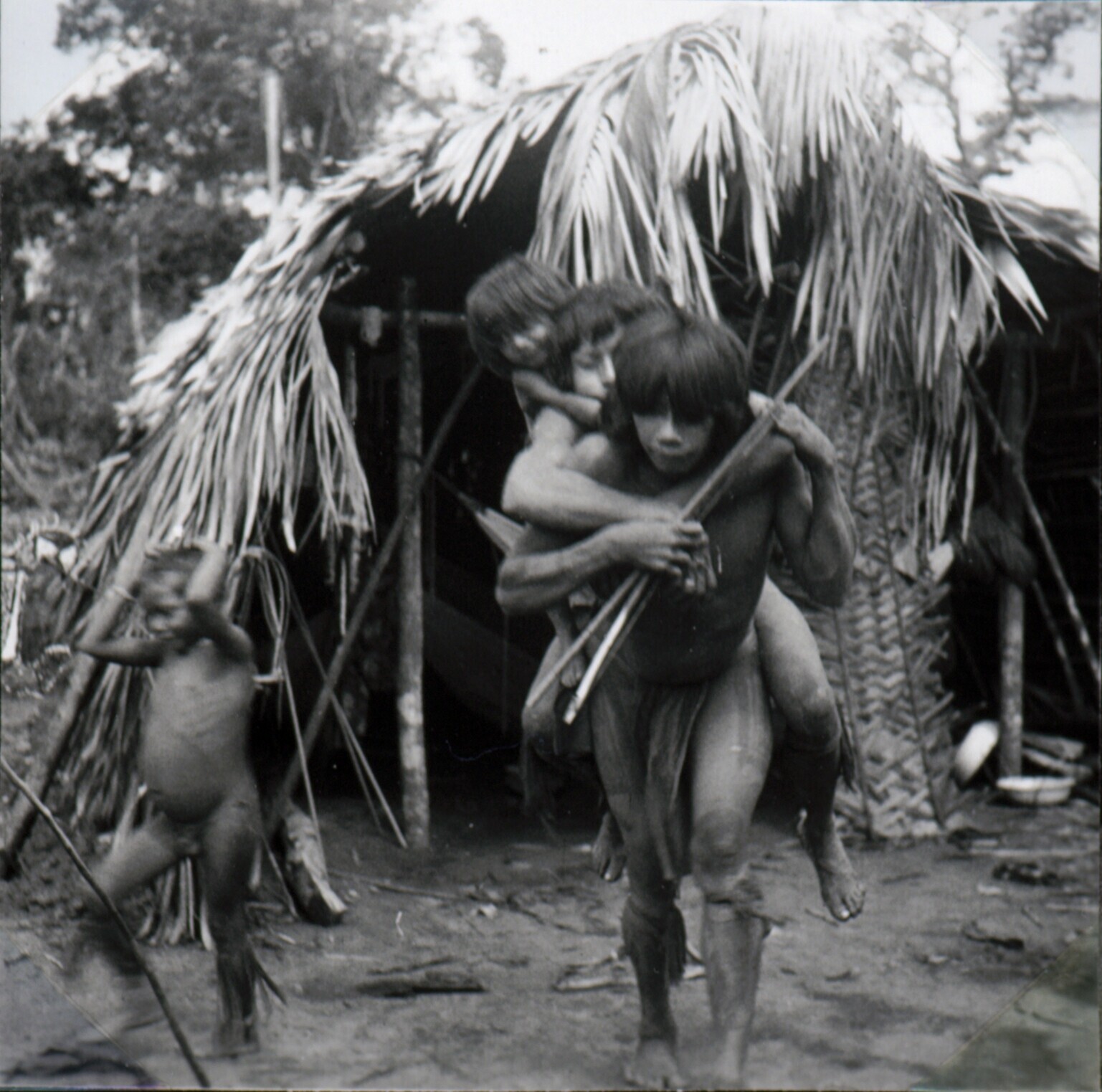 Wajana kinderen spelend rond hut in een dorp in het stroomgebied nabij de Litani-rivier in Suriname