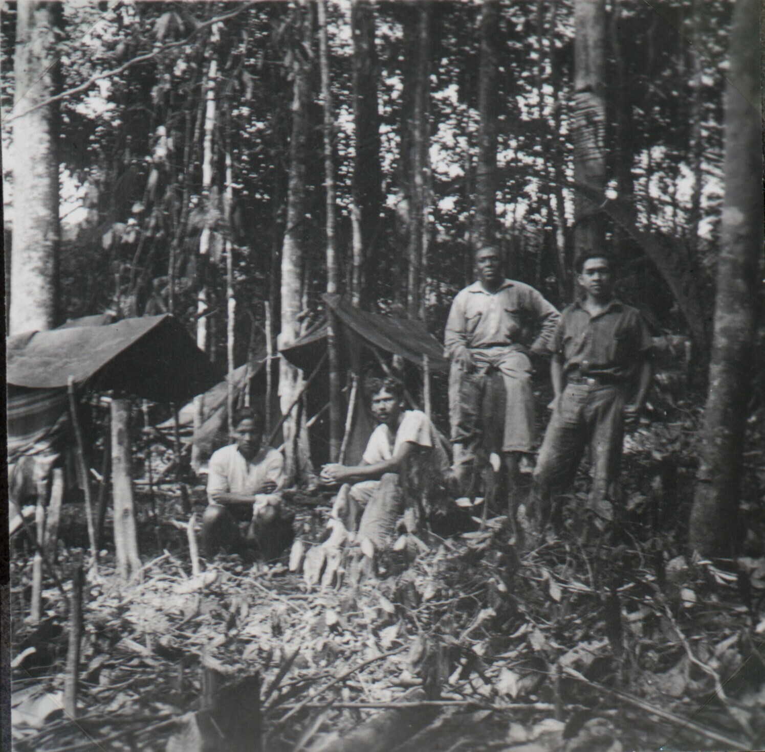 Groepsportret van mannen bij bivak nabij de Litani-rivier, mogelijk deelnemers aan de Ahlbrecht-expeditie in 1938