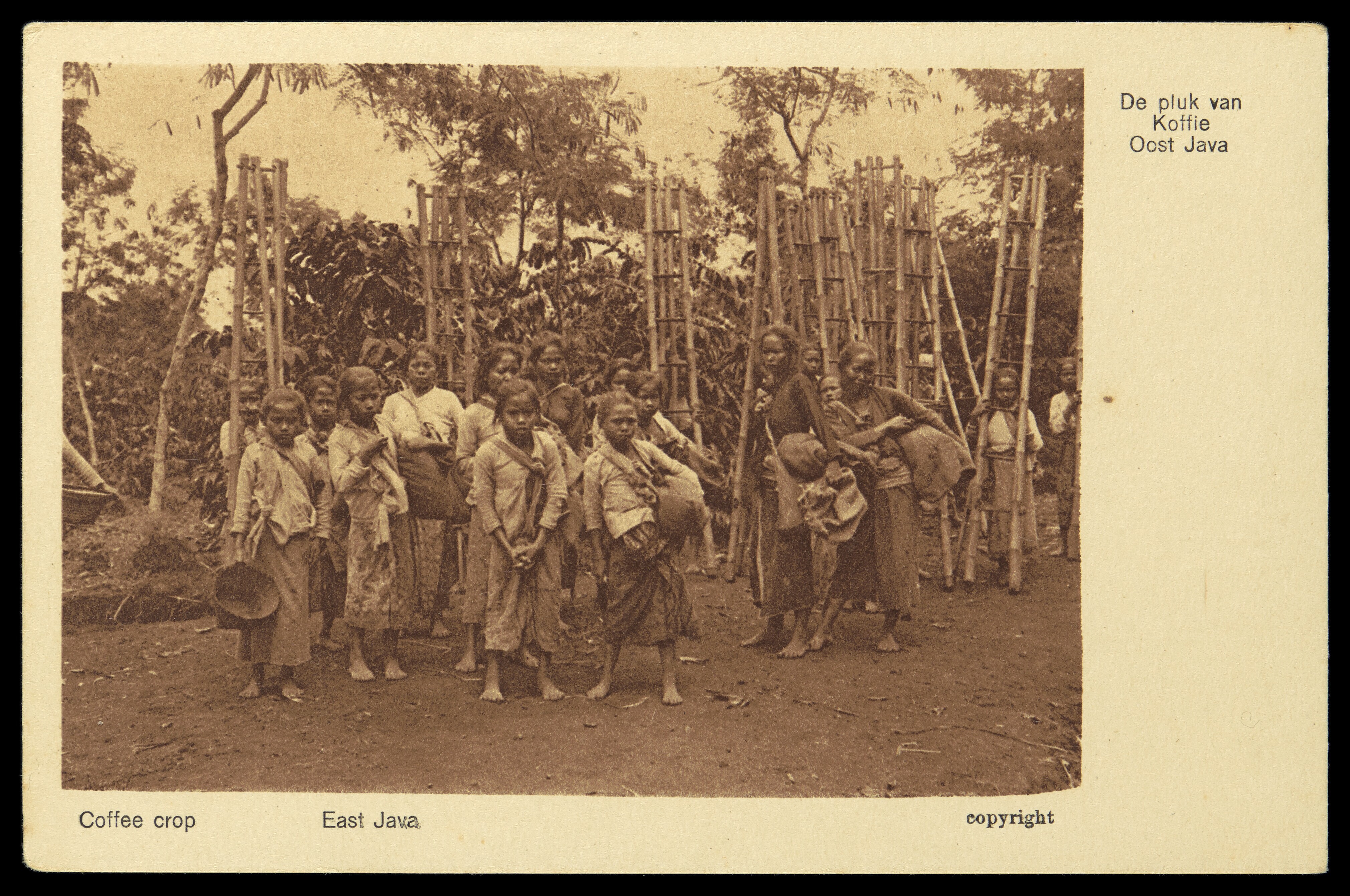 Groepsportret van arbeiders op een koffieplantage