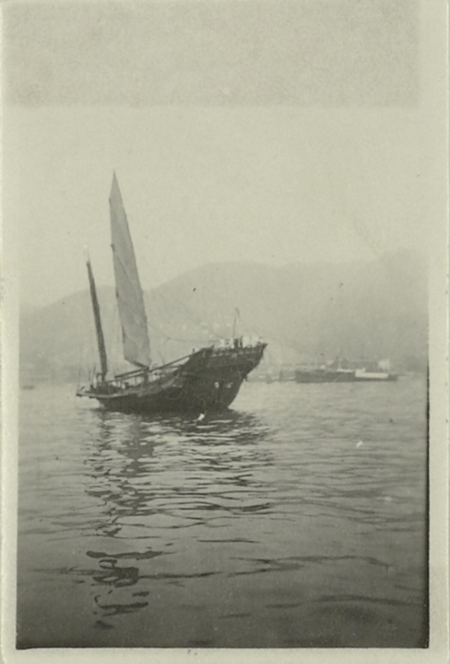 Chinese jonk te water met de kust en een gebergte op de achtergrond