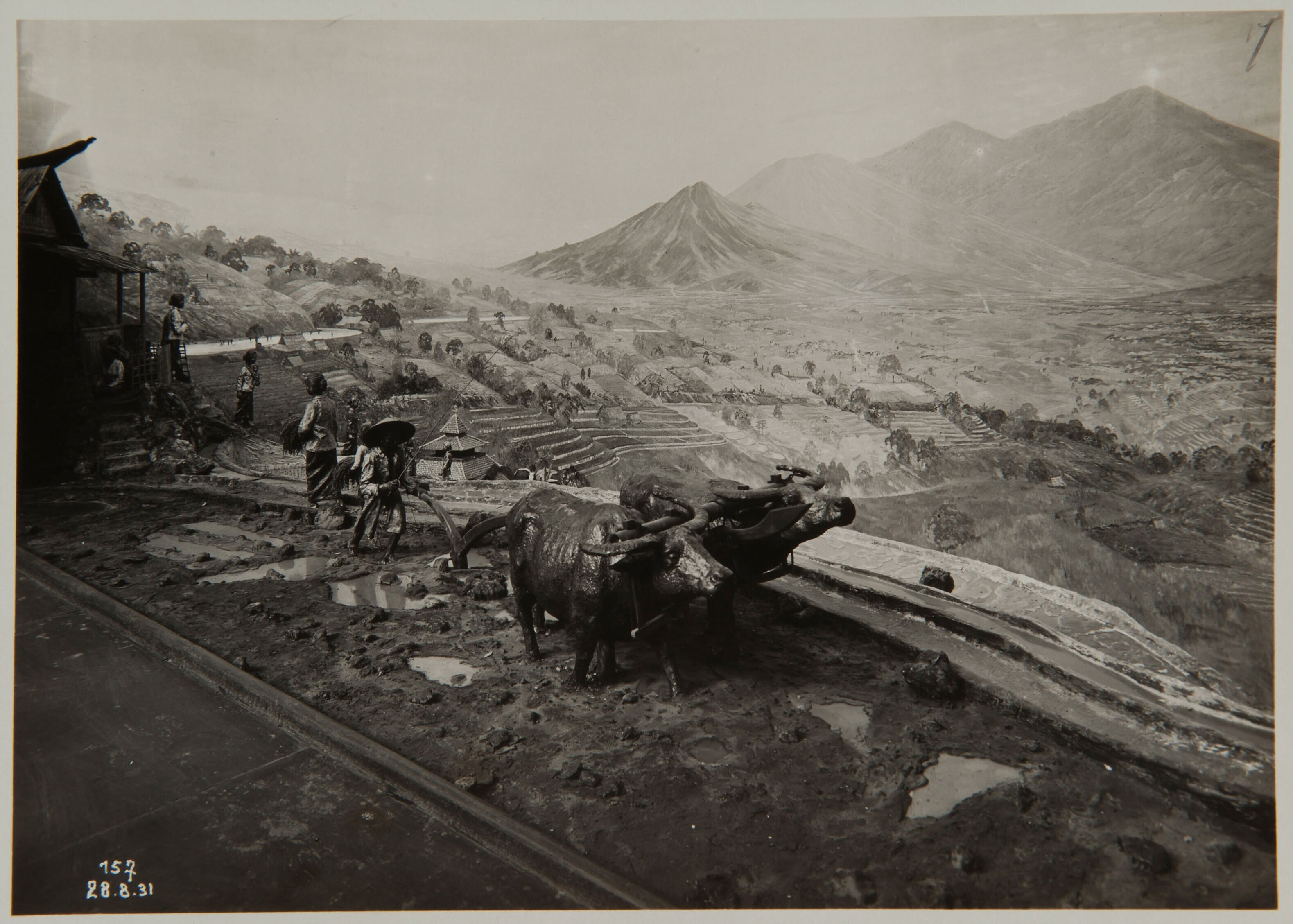 Diorama 'Paysage de Java', voorstellende de rijstverbouw op Java, in het tweede Nederlandse paviljoen op de Koloniale Wereldtentoonstelling