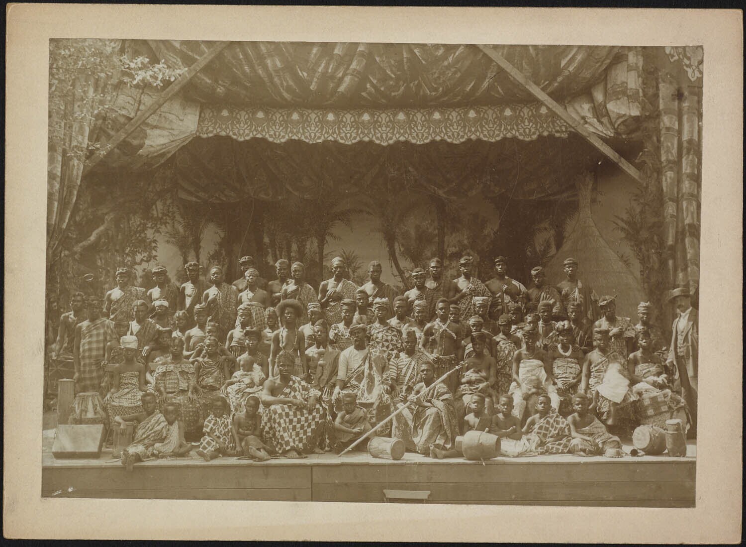 Groepsfoto van bewoners van een Ashantidorp genomen in de Weense dierentuin