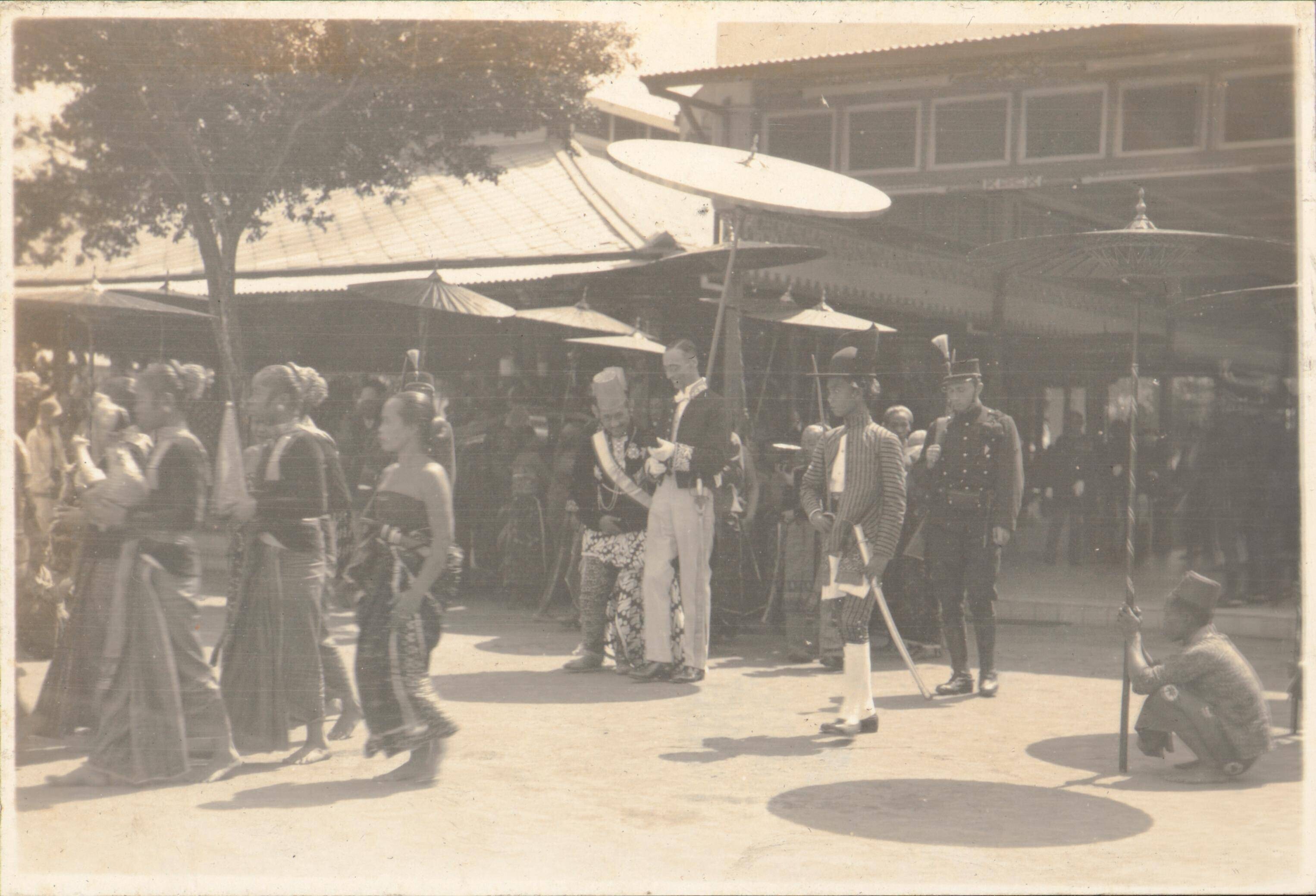 Sultan en Europese bestuurder in een optocht omringd door adel en parasoldragers