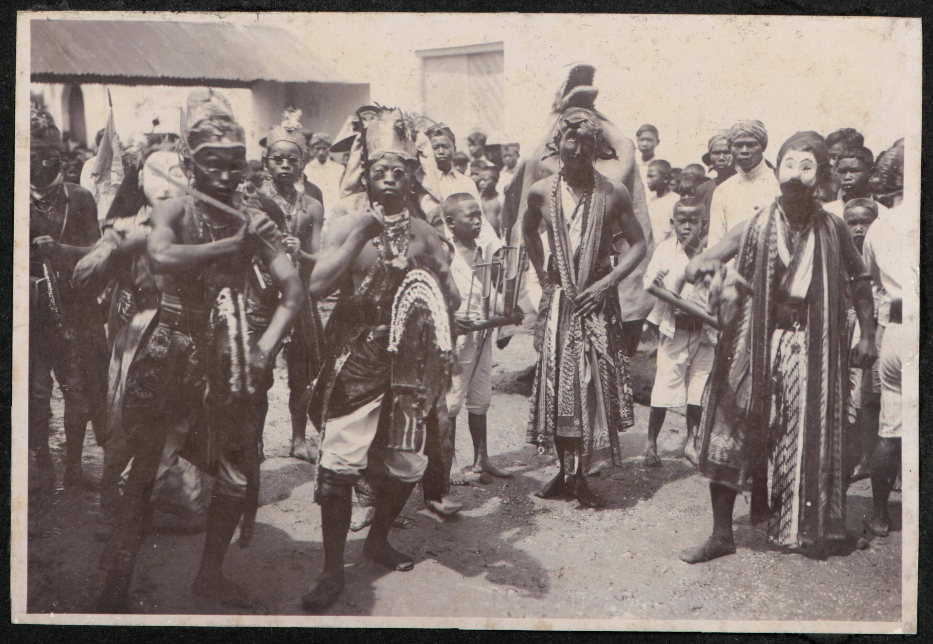 Twee gemaskerde personen temidden van andere dansende en musicerende mensen en toeschouwers