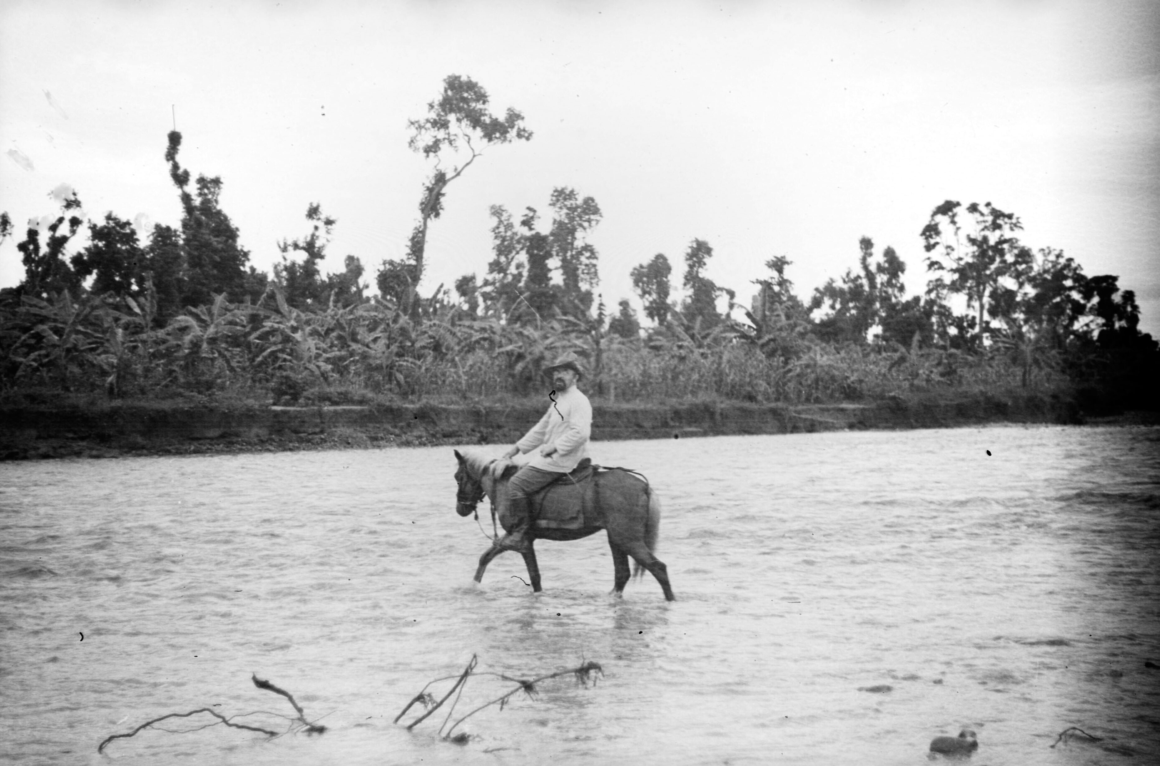 Man waadt te paard door de rivier