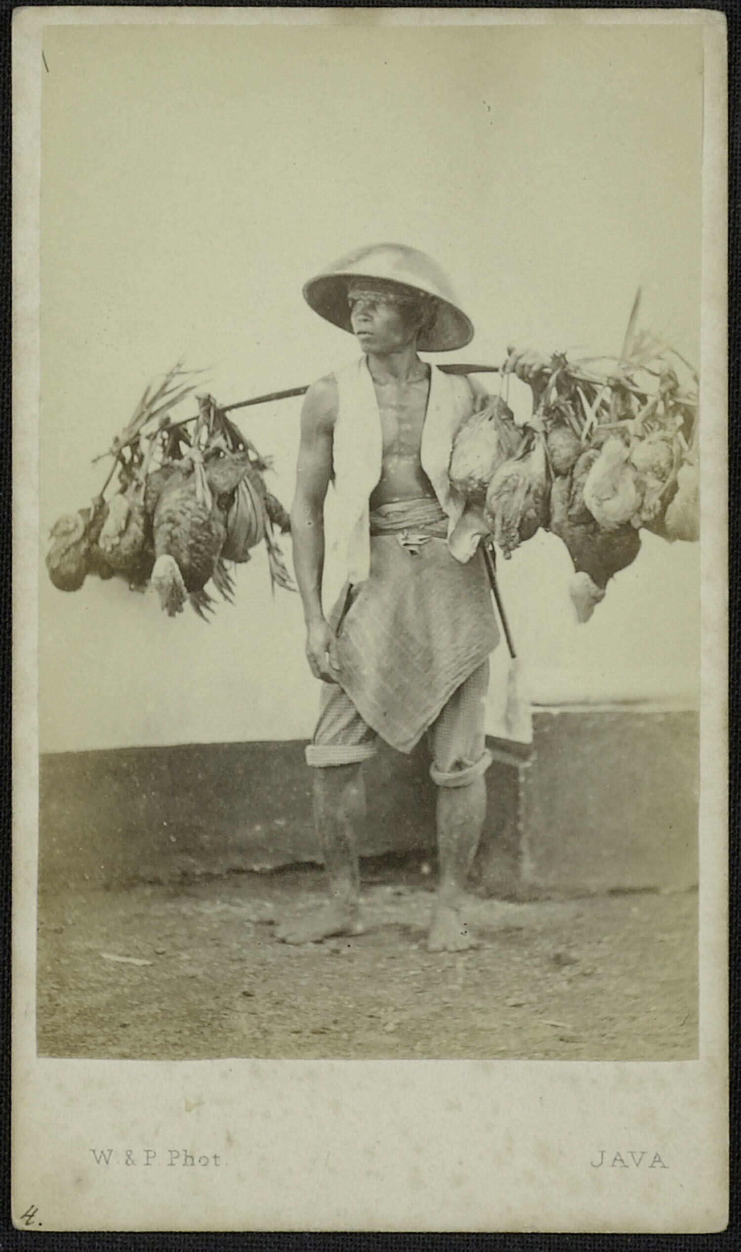 Javaanse kippenkoopman zijn handelswaar over de schouder met zich meedragend