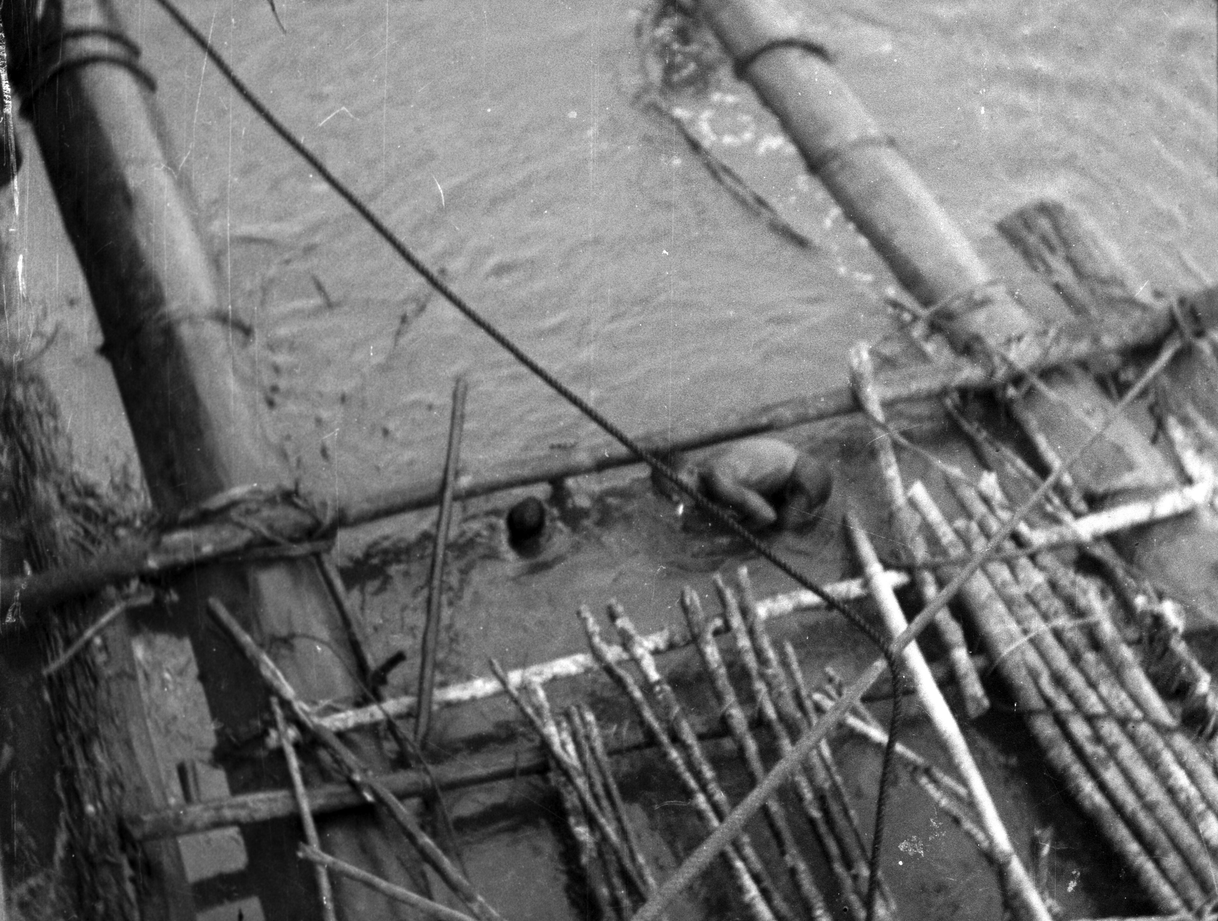 Arbeiders aan het werk rond een met boomstammen geladen vlot op rivier