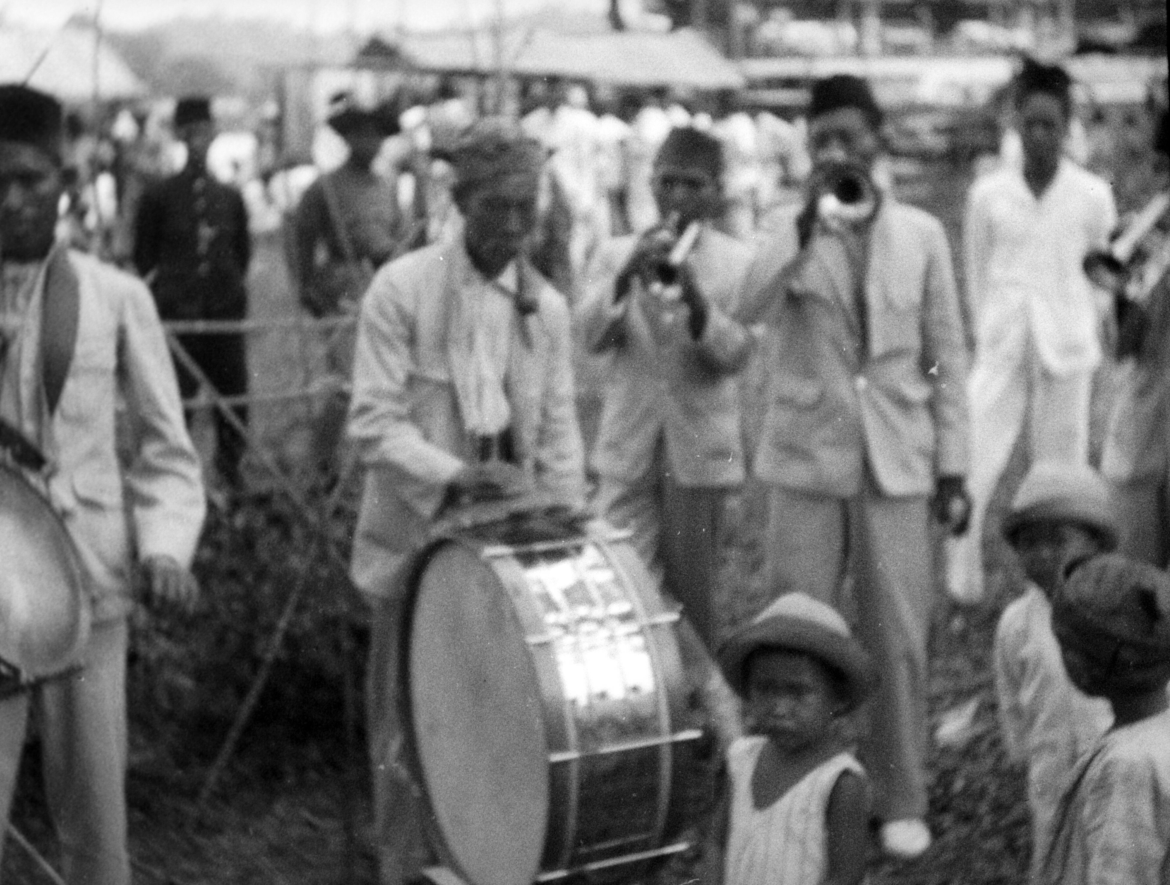 Fanfare tijdens het formeren van een stoet te Tandjoeng Redeb Borneo