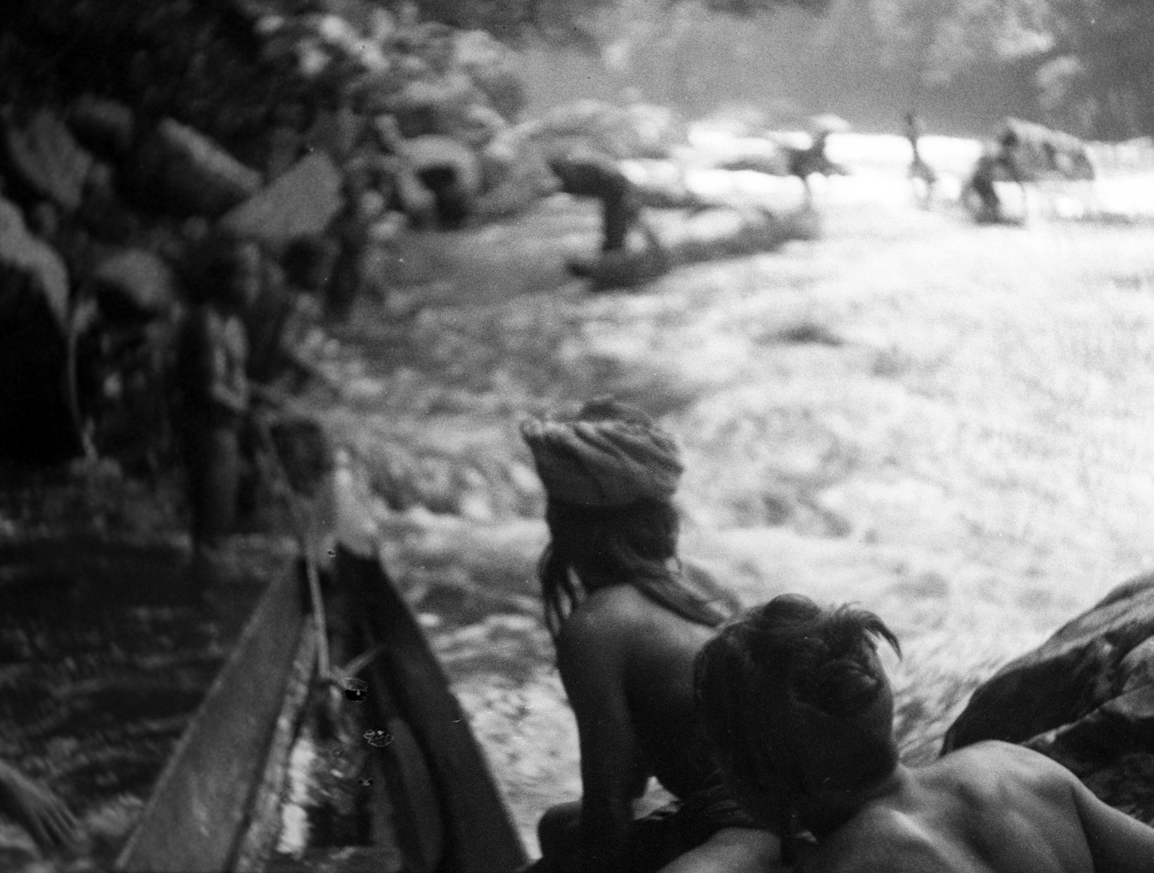 Kleine prauwen bij stroomversnelling in de Kelai-rivier nabij Segah