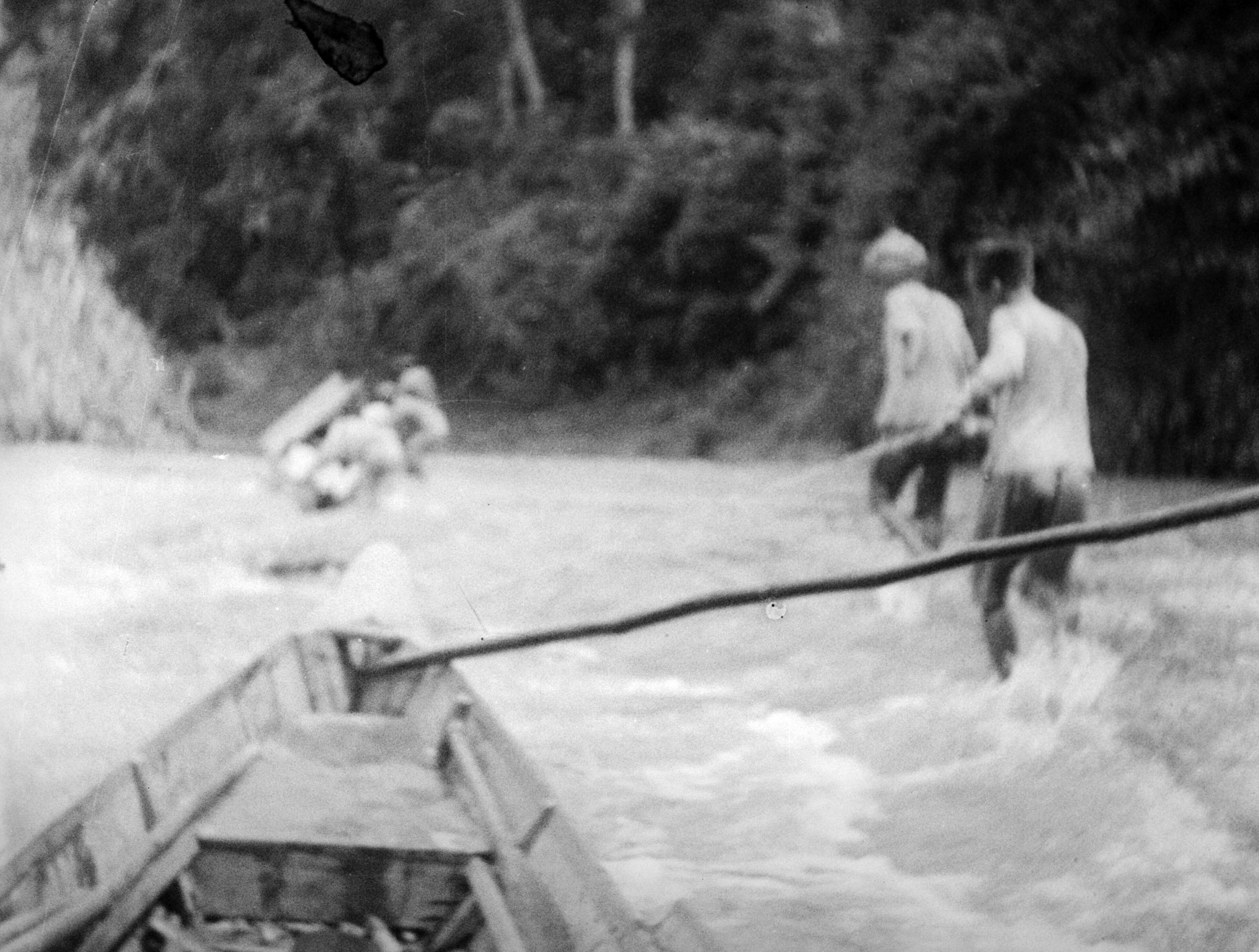 Doorhalen van prauwen bij een stroomversnelling in de Kelai-rivier nabij Segah