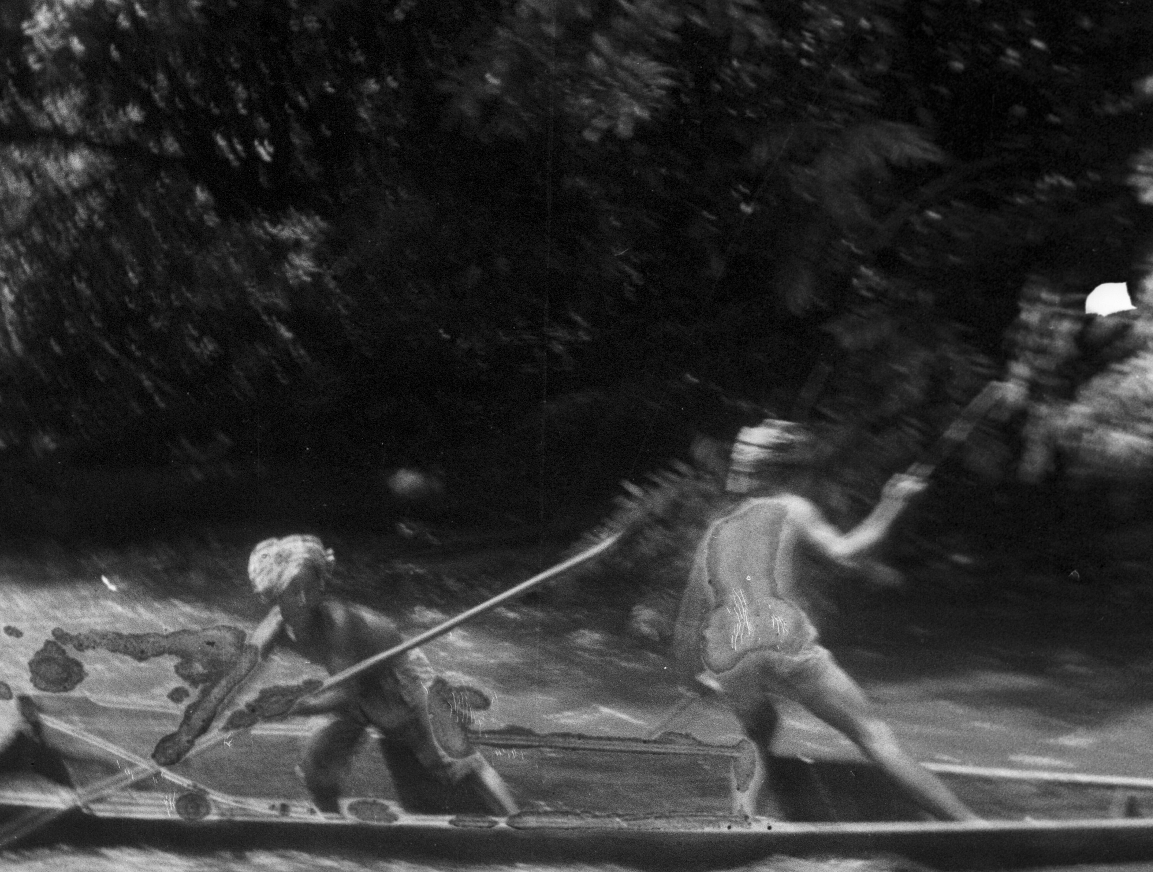 Prauw met twee mannen bij een stroomversneling in de Kelai-rivier
