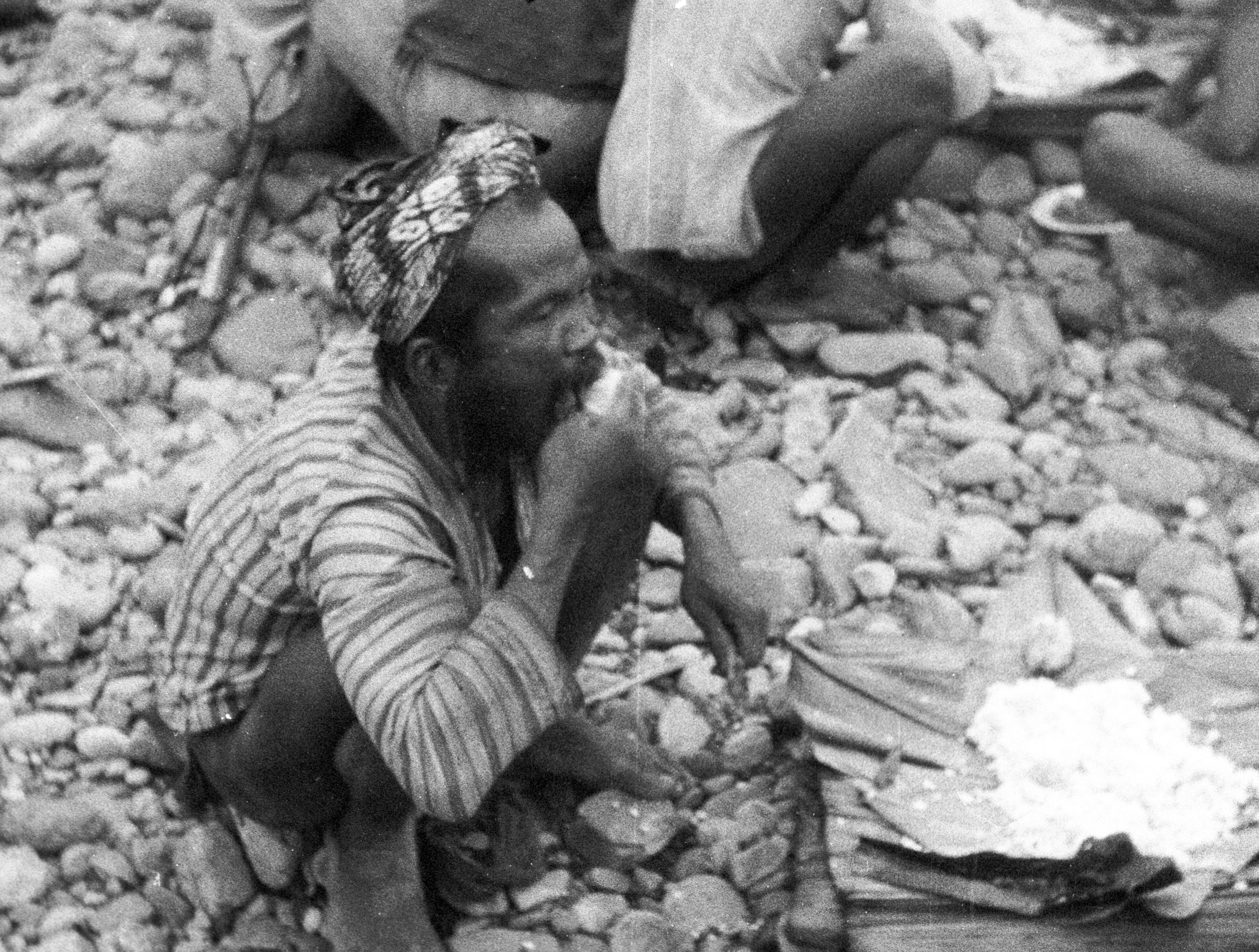 Mannen een rijstmaaltijd nuttigend aan de rotsachtige oever van de Kelai-rivier