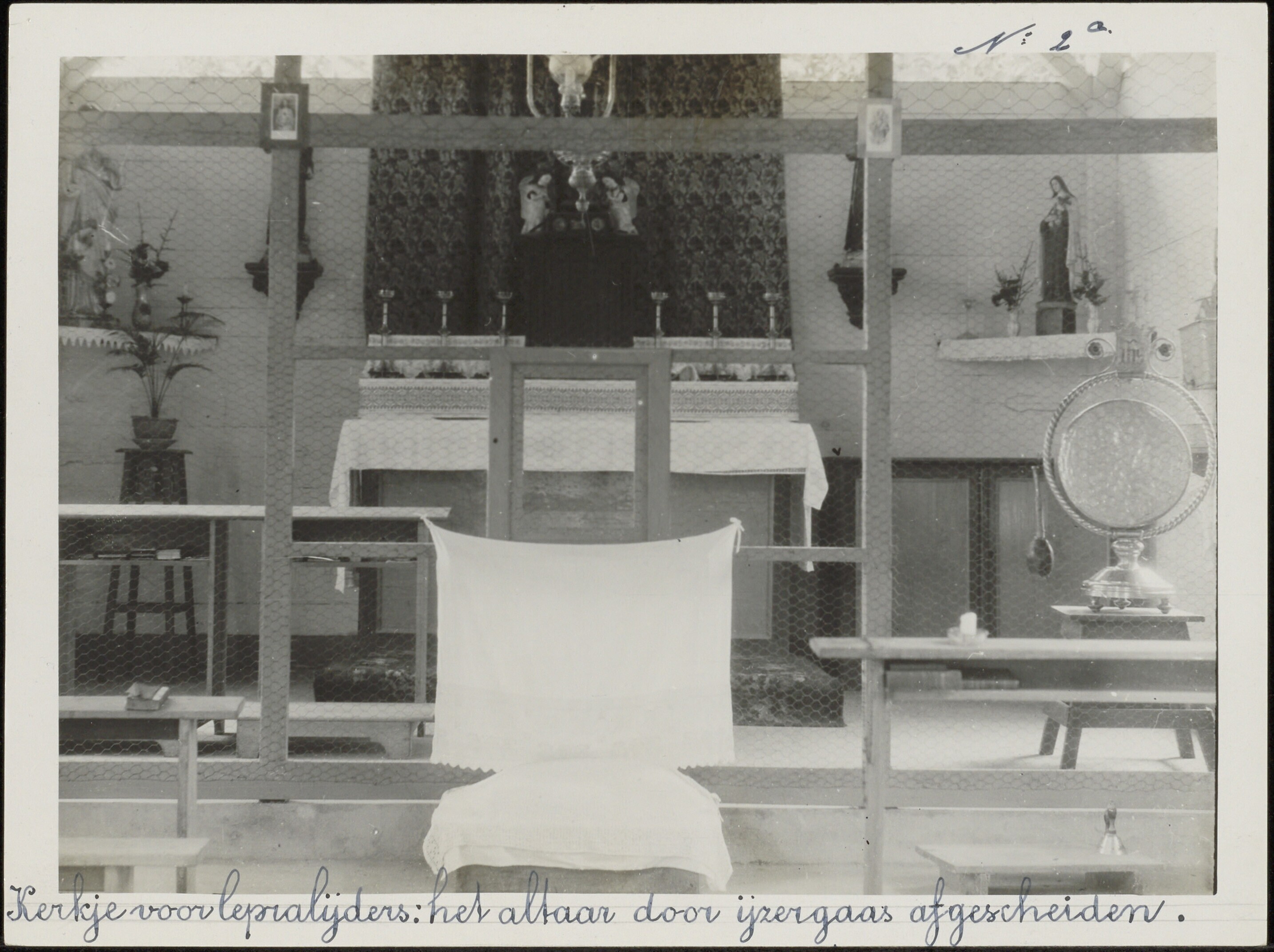 Een altaar in een leprozenkerk afgescheiden door ijzergaas